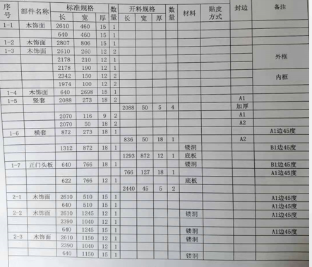 b、备料员根据拆单员所拆的材料清单图纸再次分解出各部位材料的数量、尺寸、规格,出具毛料清单进行备料。