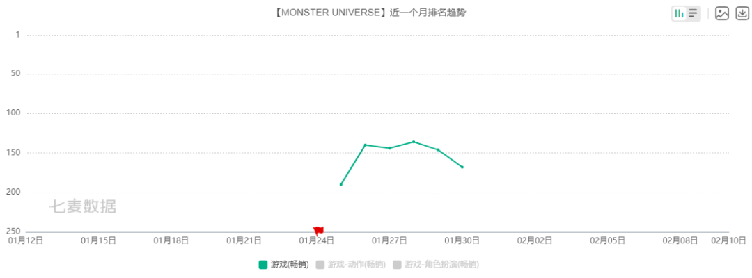 按理来说,这个赛道以及与之相近赛道的新品,各方面素质不会低,市场预期更不会低,但《怪兽宇宙》自1月24日上线以后,仅一周时间,就从畅销榜上消失无踪,最高只拿到该榜单的136位,可以说是开局即退场。