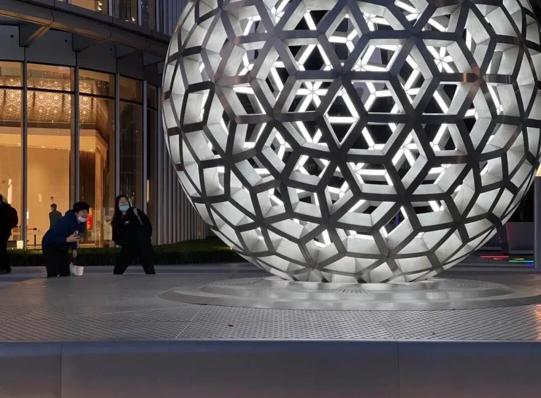 方形基座搭配球形雕塑主体的天圆地方艺术装置,是北京文化创意本土化的体现。方形基座是由可通风的冲孔板材料制作,球体雕塑制作原理来自儿童魔术伸缩球,是由数个五边形,六边形的模块链组成;球体外部采用简洁、光泽度高的拉丝不锈钢材料,内部则采用白色LED花瓣灯打造。