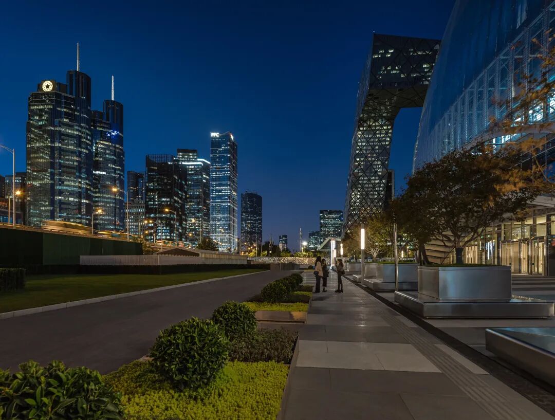 与建筑"天圆地方"的设计理念统一,提升场地识别性。天与圆象征着运动;地与方象征着静止;两者的结合则是阴阳平衡、动静互补。建筑主体从标准正方形基座开始逐渐慢慢变化,当塔楼升至全高时变成椭圆形平面。景观设计将天圆地方的理念蕴含其中,完美融合时间空间、发展稳定的理解,实现景观与建筑的合理对话。例如:与大体量建筑相对应,通过简洁连续整体的铺装及城市家具,刻画高密度城市公共空间的宽阔感。精致高品质的城市家具融入企业文化。