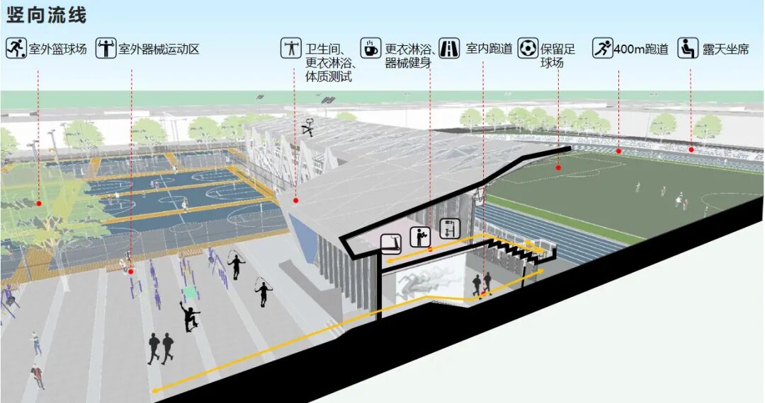 项目设计针对停车系统优化、慢行体系构建、体育功能梳理、校园文化凝练的设计目标,以航天飞天的形象意向、轻盈简洁的折板结构、清晰便捷的流线梳理,增加了修缮室内外运动场地、改善体育运动服务设施、增加校园文化特色、提升校园建筑形象品质。