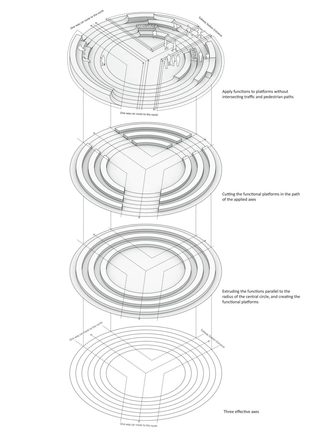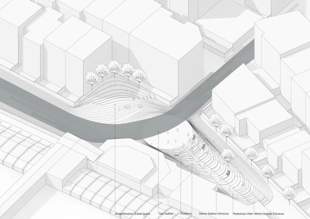 By closely studying the flow of pedestrians and vehicles alongside local vendors in the zone, the first step in the design process was to shape the flow of passengers that get off at this train station and spread into the neighborhood in very short time intervals. By studying the intersection of vehicle routes, metro passenger traffic, and the north street, the team found the answer by identifying where these three paths intersect, and then used that spot as a focal point for a ripple effect. All of the events and functions were derived from these cohesive lines.