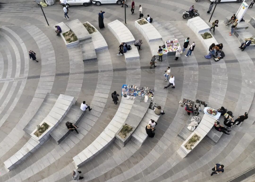 创建的第一个涟漪效果勾勒出了广场的边界,该广场一侧将用作出租车站。随着涟漪向车站入口所在的东面移动,广场增加了不同的特殊功能。在每个涟漪效应之间,都有从地面升起的长椅,确定了座位区、小贩展示商品的地方和绿色空间。