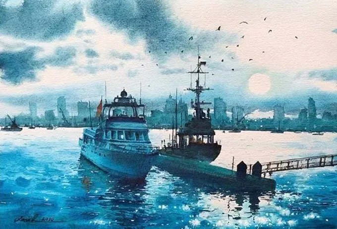 伊朗艺术家贾维德·塔巴塔比,1973年出生于伊朗德黑兰,多次参加土耳其、法国、比利时、日本等全世界多个国家的展览。他的作品整体呈现蓝绿色调,十分具有深意,这种用蓝绿色来表现海天景色,水润感、色彩感都十分充足,是独具魅力的水彩艺术作品。