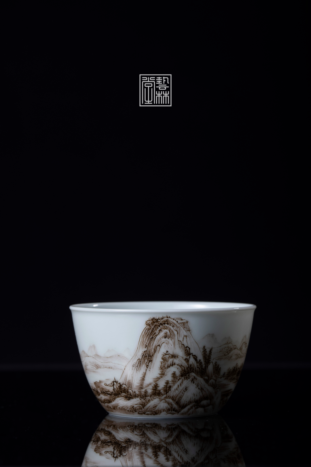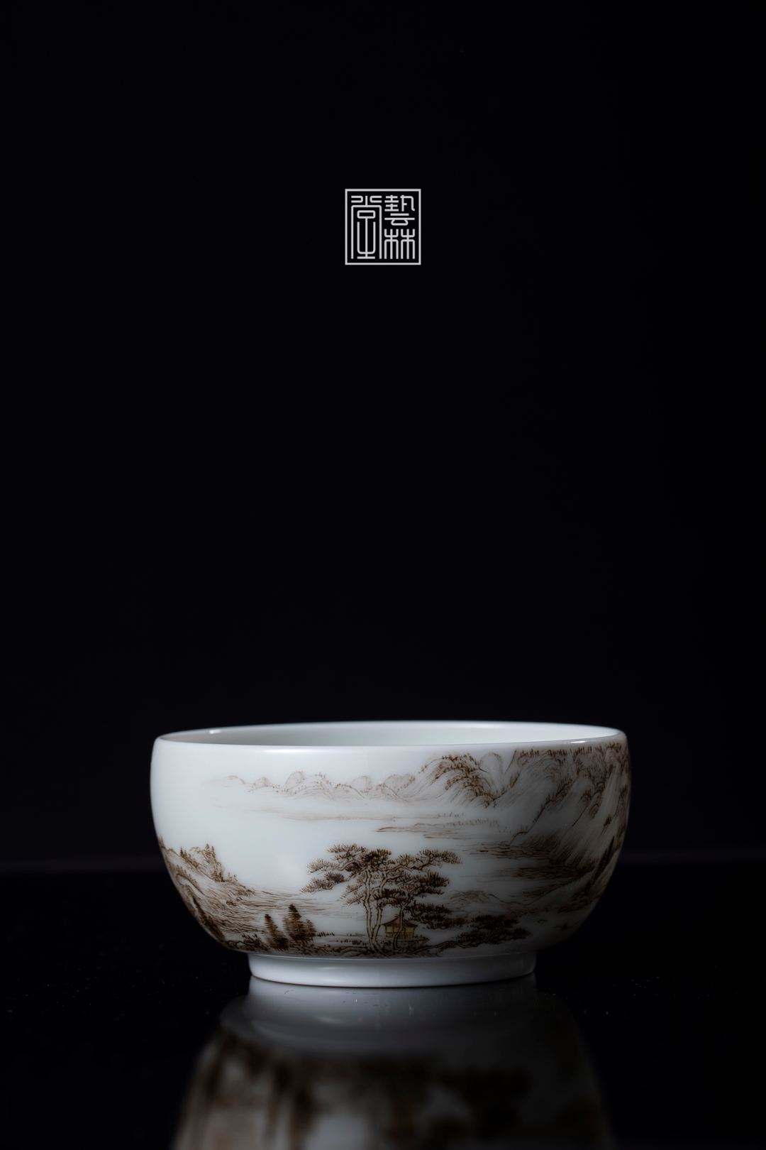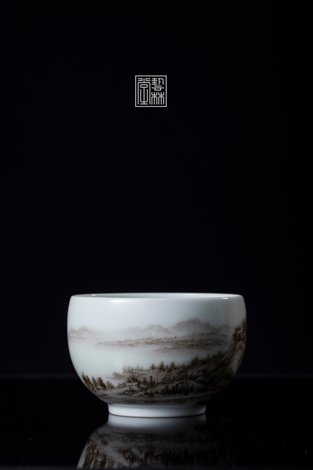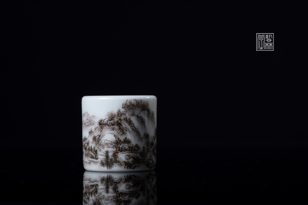 艺林堂用粉彩中的“生料”还原600年前的笔墨,浓淡相宜地在方折简约的缸杯上,延续着黄公望对越地山水无尽之思。