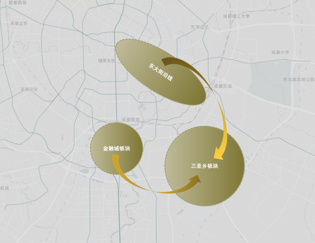 它接驳东大街攀成钢板块外溢发展、金融城板块向东扩容时代课题,一个向东,一个向南,东南方向的三圣乡有大片土地待入市,恰好承接两个区域发展外溢。