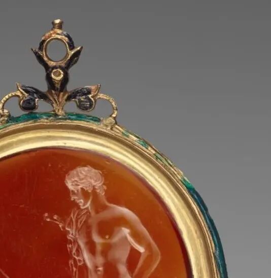 如今,盖蒂博物馆的网站上就可以查询到这枚印戒,不过博物馆将描述改作了“描绘有维纳斯和安喀塞斯的微雕宝石”。显然,盖蒂的专家认为这里表现的是美神维纳斯和特洛伊美少年安喀塞斯,她俩正是罗马人的先祖埃涅阿斯的父母。