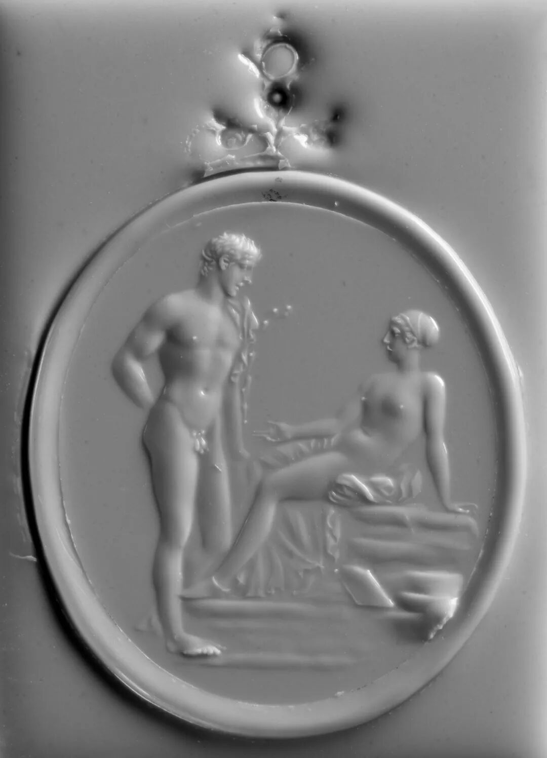 土耳其的阿芙罗迪西亚斯博物馆收藏了一件描绘这对情侣的罗马大理石浮雕,其中两位人物的姿态和此枚宝石微雕印戒相似,衣着略有区别。