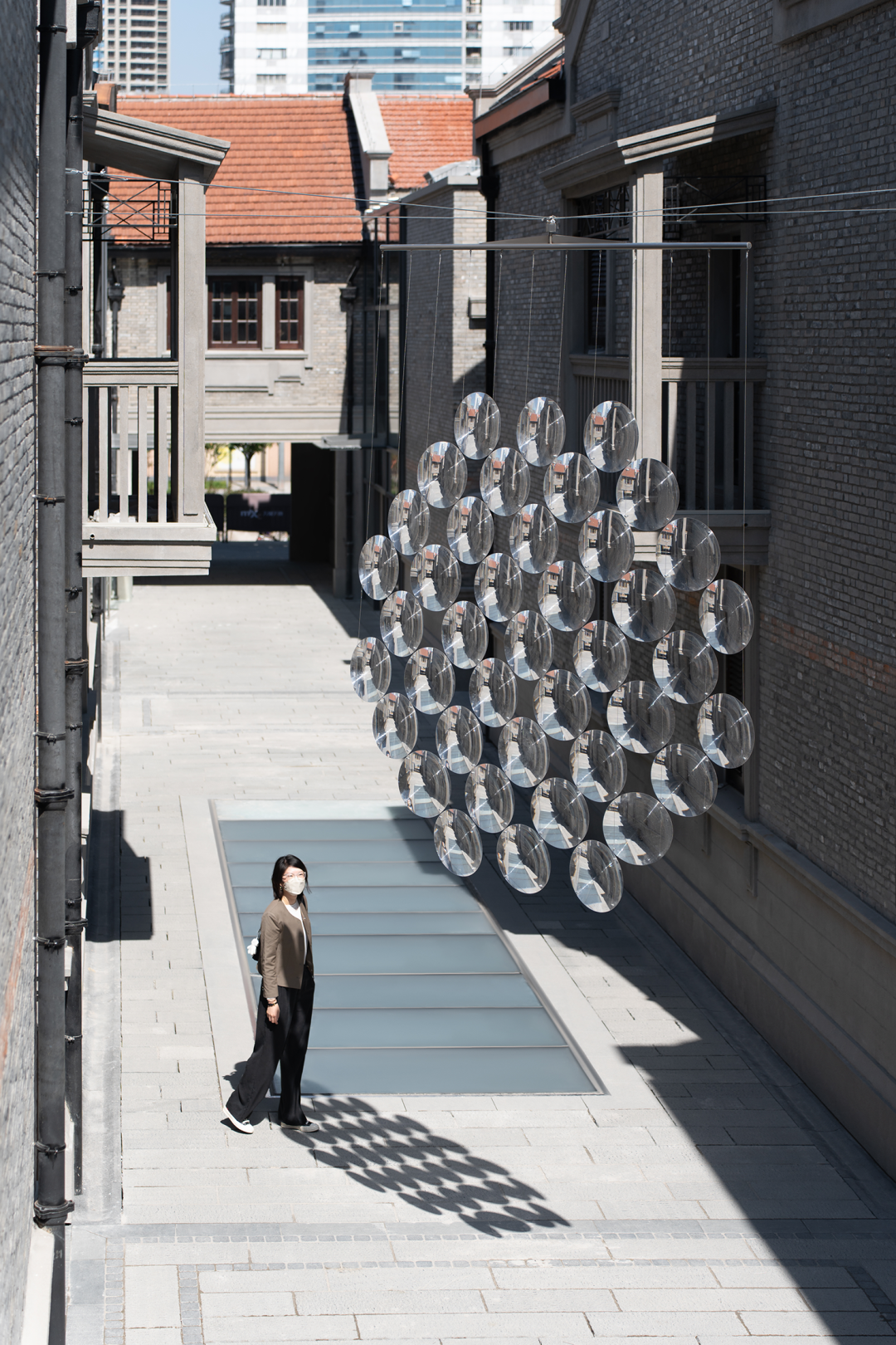 水作为一种流体,与梦的形态相似。从这个意义上说,“梦游”就是在水中游。在位于福建路桥下方的地下连廊,艺术家张海超的《HELLO WAVE_拟态场域OFFLINE》利用算法图像程序模拟作品所在场域苏州河的同色系水波视觉,并邀请观众用身体激起数字涟漪。同时,作品还实时获取日照数据,生成与现实苏州河同步的光效,从而形成以“拟态环境” (pseudo-environment) 为内核,以生物形态模拟算法图像为视觉形态的拟态场域。穿梭其间,观众如同刘易斯·芒福德 (Lewis Mumford) 所谓“城市戏剧”的剧中人,并借由数字异域重思现实城市时空的意义。随后,数字河流将我们引向在时空中缓行的章节——代表旧时上海居住经验的海派石库门建筑群落“慎余里”法国艺术家文森特·勒鲁瓦 (Vincent Leroy) 用41片菲涅尔透镜组成的大型装置《慢镜头》,正在十字路口的“穿堂风”中摇曳,并折射出的时空感知的不确定性。艺术家强调露天环境对于作品的影响,并认为这两者之间是有某种相互作用的。与在美术馆内部进行装置设计不同的是,他希望在作品中引入更多的自然因素,例如风向和光线。因此,勒鲁瓦利用如梦般轻盈的街巷微风,轻松的将弄堂原本方正笔直的环境转化为随机变幻的视觉迷宫。