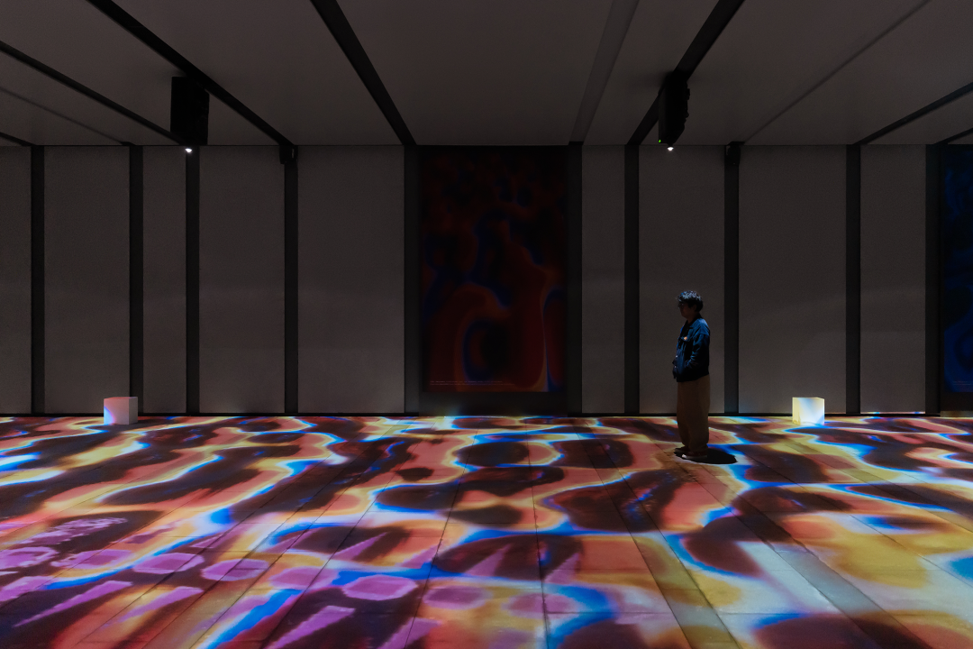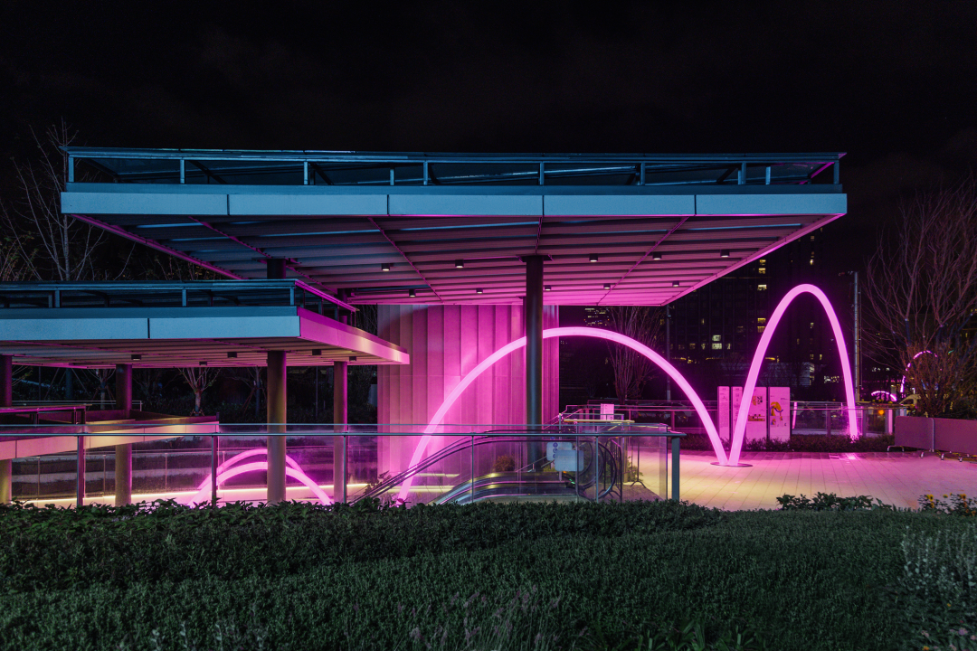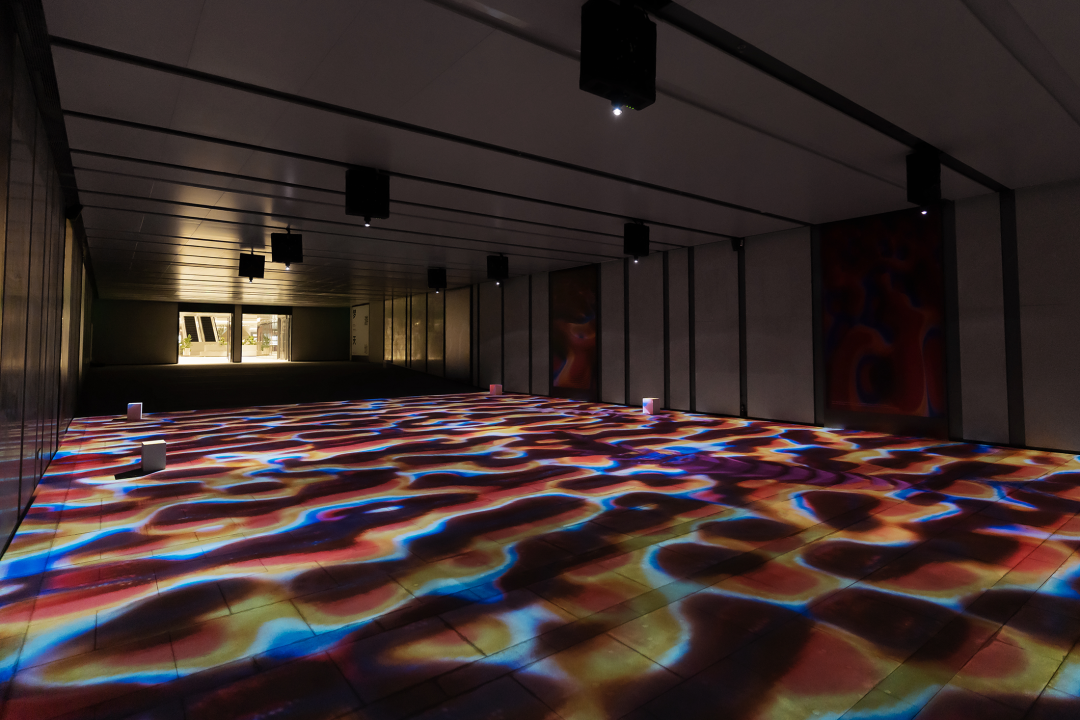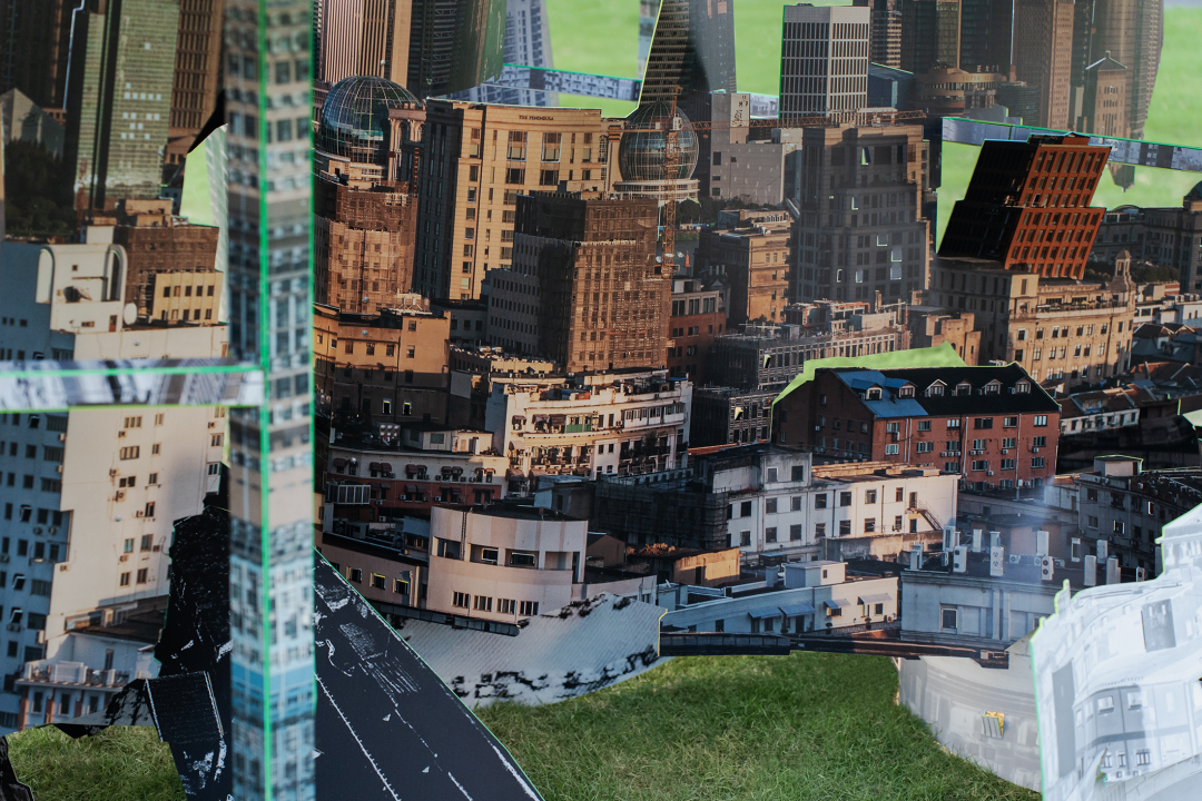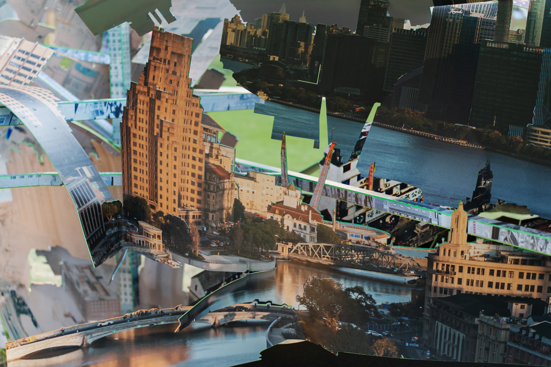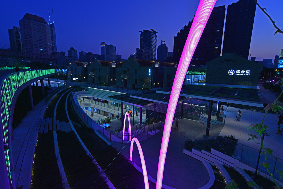 对于艺术家谭英杰来说,“游”字让他联想到中国的造园传统,以及与此相关的中国文学传统中的“镜像世界”——比如《红楼梦》。在其作品《上海折叠》中,艺术家截取时间跨度近百年的上海城市图景,并对它们作镜像处理,超平面化的图像被裁切、扭曲,建构出一幅亦真亦假的上海图卷。Fn Media Lab则利用线性的LED灯管在空间中进行“涂绘”,蕴藏着本地历史记忆的曲线在场地中横穿纵贯,成为一种开放的导视系统,并缔结了文保建筑、海派建筑群落、河畔景观、城市绿地与消费场景等不同时空图景之间的关联。