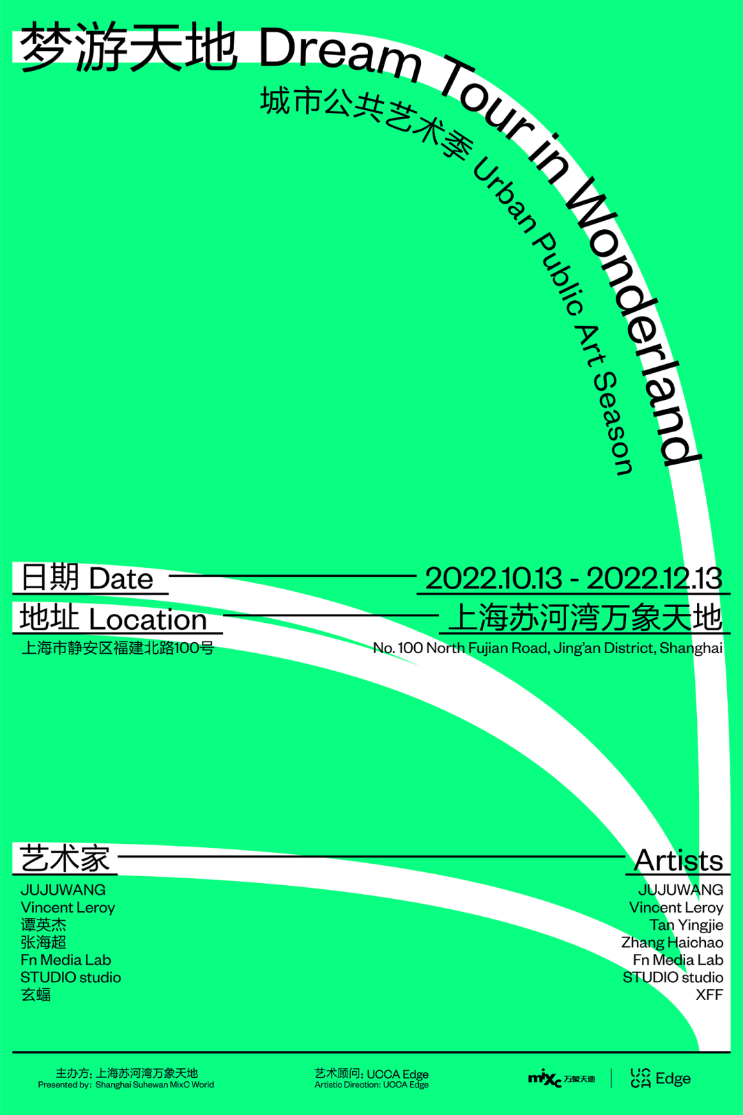 实际上,上海已经在城市公共艺术领域进行了多年实践,并形成了颇具规模的生态,其中也不乏与商业空间相结合的尝试,而这一系列实践的最新篇章,便是10月13日至12月13日期间由上海苏河湾万象天地和UCCA Edge联合呈现的“梦游天地——城市公共艺术季”,项目邀请艺术家JUJUWANG、文森特·勒鲁瓦 (Vincent Leroy) 、谭英杰、张海超以及Fn Media Lab、STUDIO studio、玄蝠XFF创意团体在苏州河畔拥有多重时空情境的场域进行委任创作。作品的类型涉及艺术装置、算法交互程序、数字虚拟内容和AR互动程序等,将当代生活方式和消费场景作为公共艺术及其观众的舞台。“梦游天地”重构了项目所在商业空间,这让人不禁联想到汉语“城市”一词中“市”的最初含义,以及构成我们今日生活方式的主要内容。与其说公共艺术将城市转化为“展场”,不如说公共艺术又回到了城市生活的肌理之中。“梦”的灵感源于在《爱丽丝梦游仙境》中超越逻辑、充满无限可能性的“超真实”世界的穿梭感,这正与“梦游天地”所在场域的时空情境契合。为此,策展团队邀请艺术家创作爱丽丝的形象,作为艺术季的特邀体验官,如坠“兔子洞”般引领观众进入梦幻体验的线索链路;“游”则指向以苏州河的水文景观,同时提示了主体在项目中的位置:观者展场中“具身” (embodied) 的游走、穿梭,对应的正是生活世界的一个特殊时刻,“我”在其中出神、跑题、梦游……