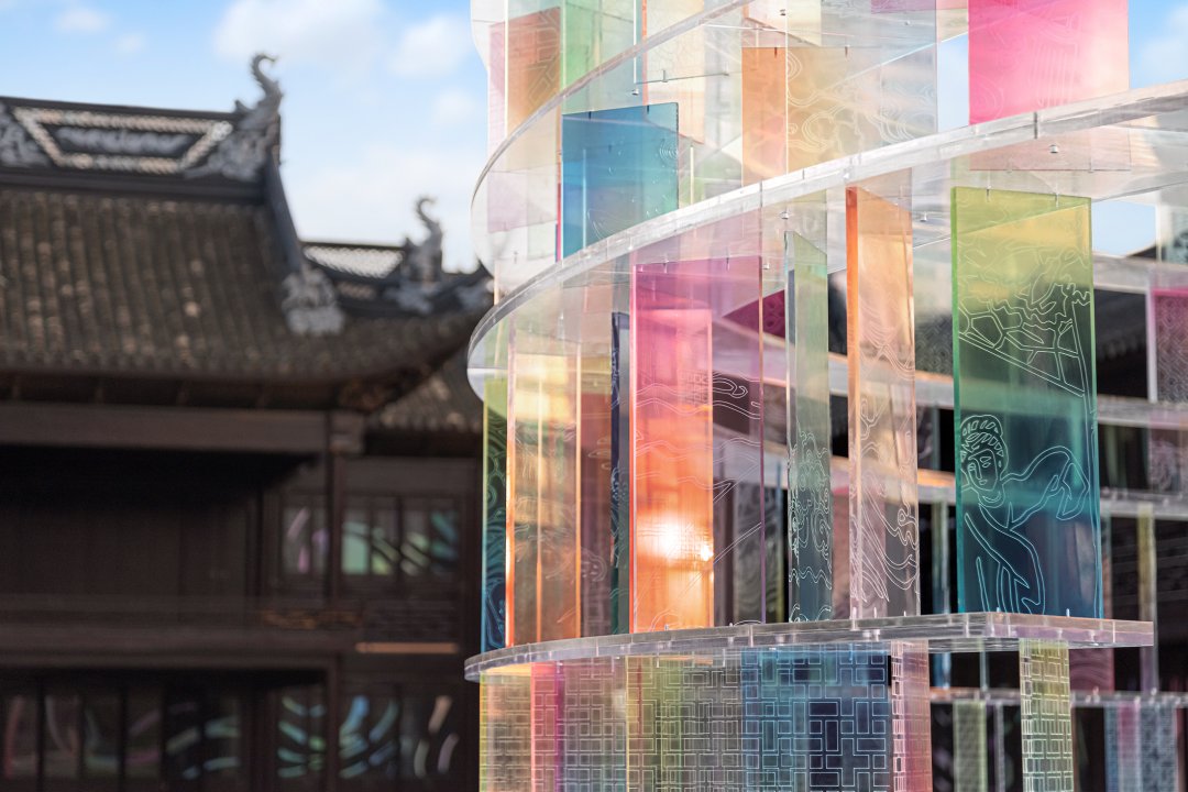 始建于1884年的“天后宫”是江南殿堂式古建筑,也是上海历史上体量最大、规格最高、形制最全的妈祖庙。它是现代上海传统底色的代表,同时也是这座城市与海洋之间亲密关系的象征。如今,天后宫的东西看楼与戏台终于在近期完成复建,主殿则异地保护修复。艺术家JUJUWANG将历史与现实的时空情境拟人化,围绕天后宫供奉的神明——妈祖的生平展开创作,邀请出苏州河畔这一女性形象。名为《很久以前》的装置位于天后宫大殿原址,与戏台相望,象征历史与现实的梦幻戏剧在此共演。受到戏台中央藻井结构以及妈祖神奇生平的启发,108块彩色亚克力垂直嵌板构成两圈多层环形结构,将天后宫原有柱子数量(106根)完形,以抵达此时此地的完满。嵌板上刻画的图像从天后宫原有的木雕中提炼,变幻的光影穿透这些图像诉说的历史,与观者融为一体。JUJUWANG将这件作品视为一个顿悟的装置,受历史与现实的双重加持,在时间中潜移默化的影响观看者。此外,借助AR技术,辅助艺术家JUJUWANG以“探寻与重生”为主题,对天后宫原址大殿廊柱进行了概念化的重现,在与现实城市“叠景”的同时,对天后宫建筑群的全貌进行了梦境般的留白,为观众的想象力留下空间。