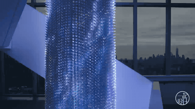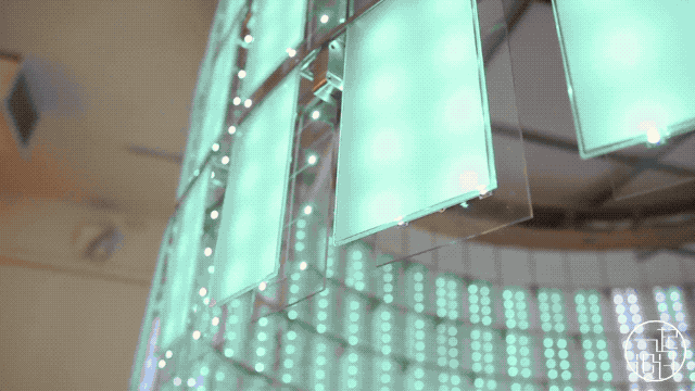 装置由1,584 块液晶聚碳酸酯面板构成,每块面板都有一个低分辨率 LED 网格,它将这些数据转换为不断变化的光、颜色和声音模式。