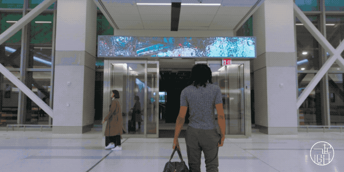 高分辨率 LED 的垂直柱子创造了一个震撼的门槛。该装置展示旅途中的美景,打发无聊的同时,也潜移默化地提醒乘客不忘注意身边的惊喜。