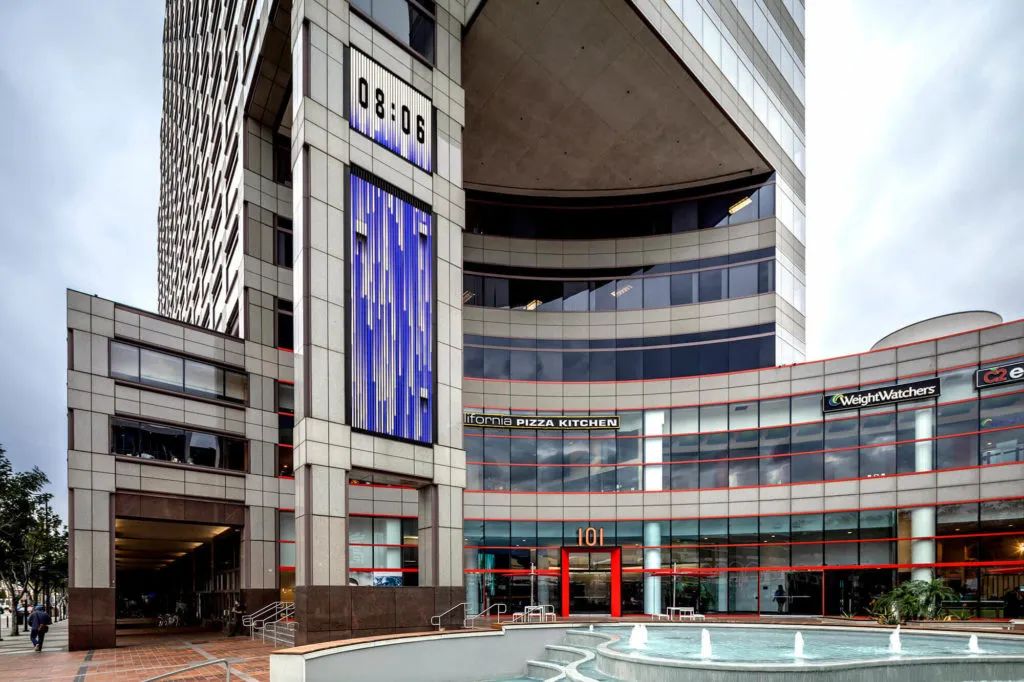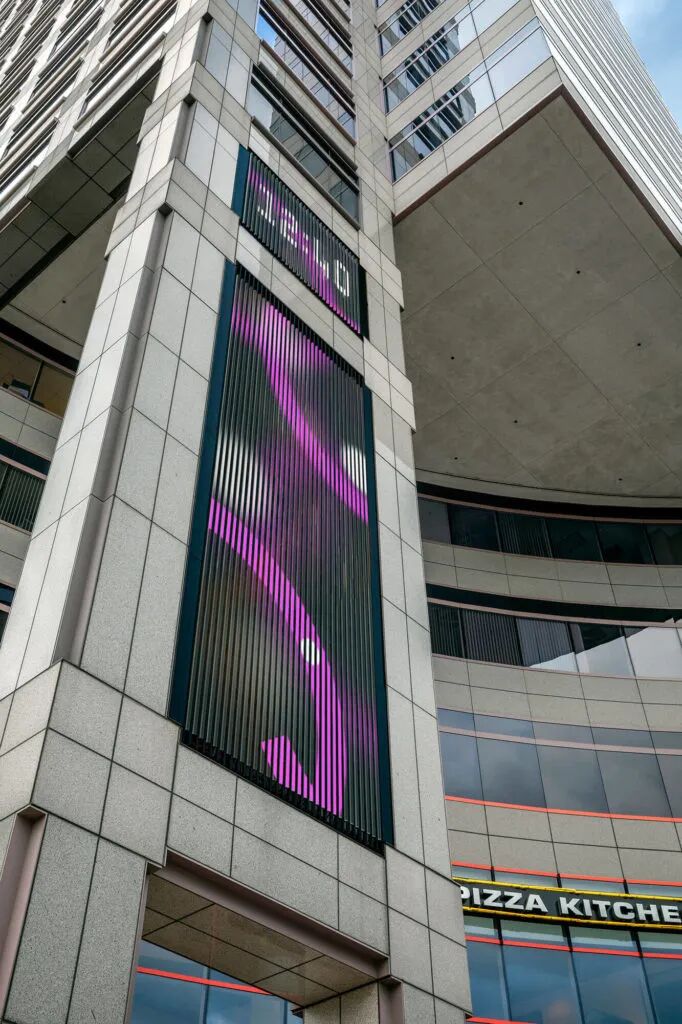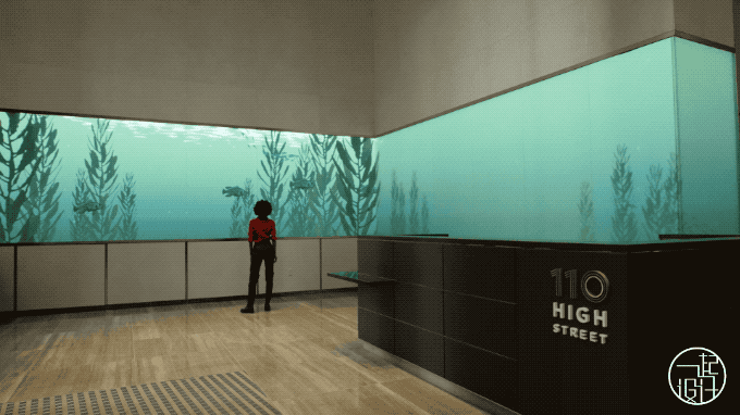 ESI 创造了一个25米高的数字媒体装置,从外看,如同一个鱼缸嵌入在建筑中。内部的屏幕上展示了大楼外的城市和远处的海湾,打破了内部和外部之间的障碍。