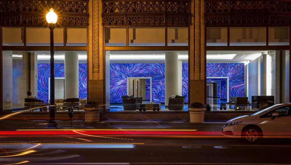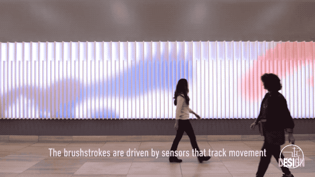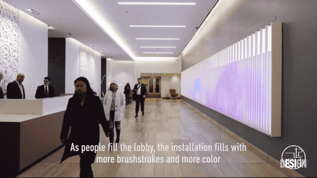 媒体由一套传感器驱动,这些传感器在访客穿过大厅时对其进行跟踪。当人们进出电梯间时,他们的痕迹变成了数字画笔,在显示屏上拖着一条彩色路径。