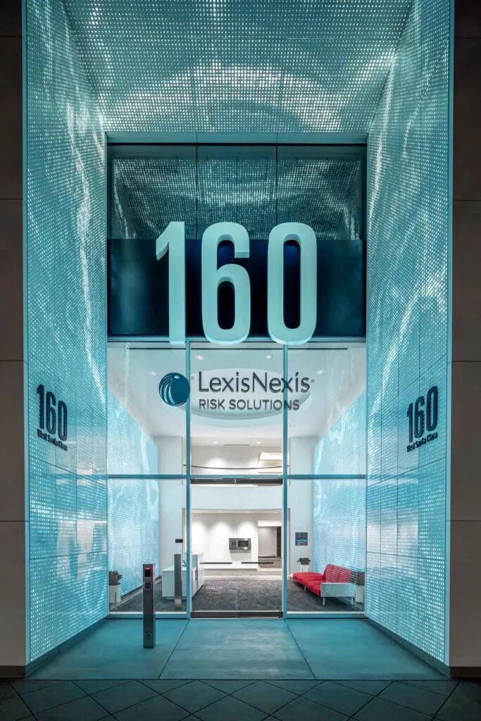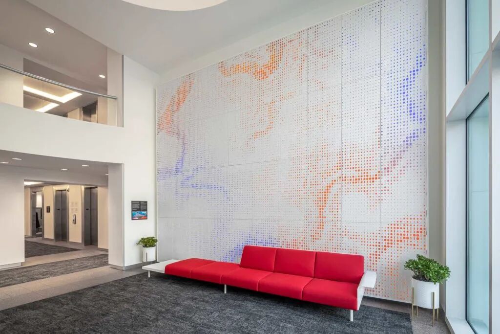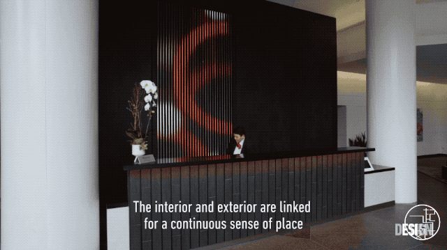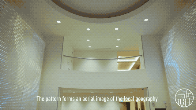 ESI 为大楼大厅及入口处设计了动态 LED 照明体验, LED 灯通过定制的穿孔金属墙片向外透露清幽的光芒。