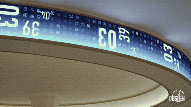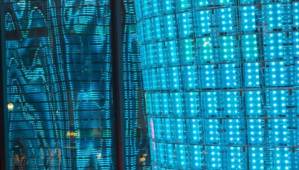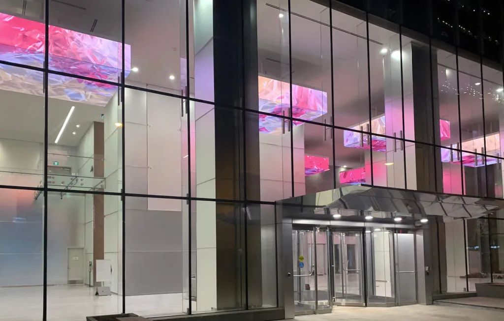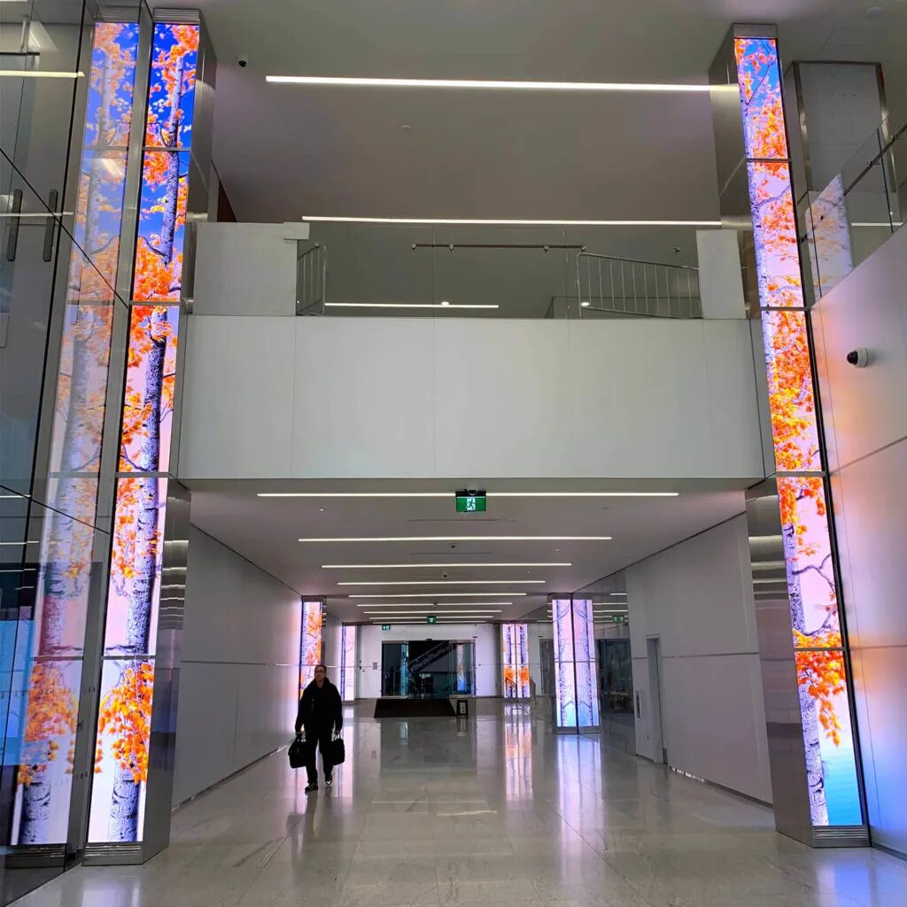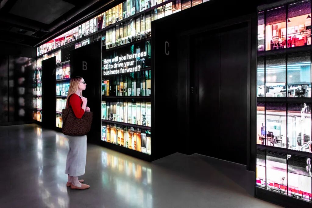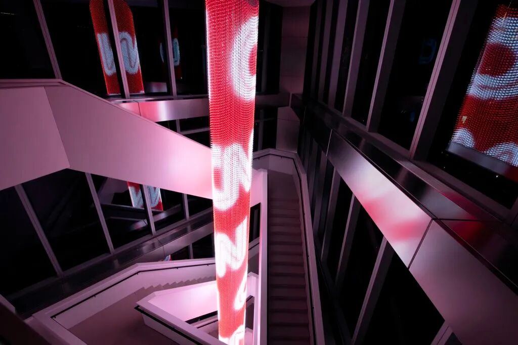 一条 LED 屏幕丝带包裹着墙壁和柱子,如同从建筑物中取出的水平切片。
