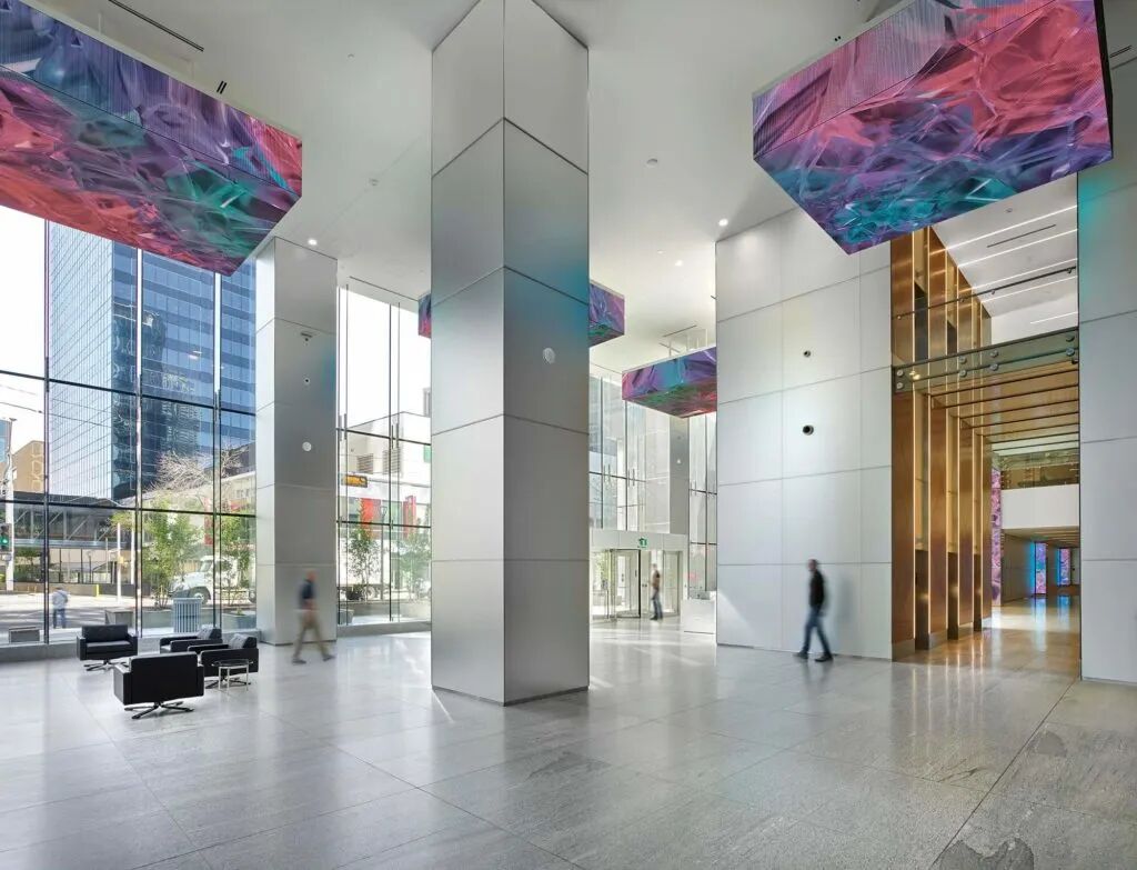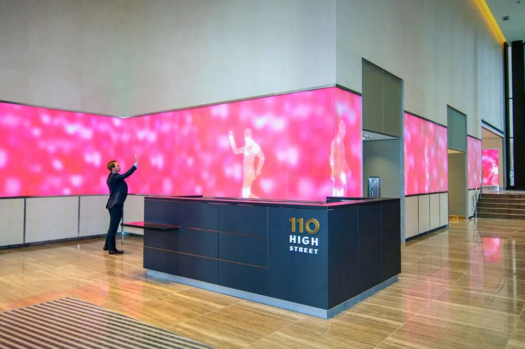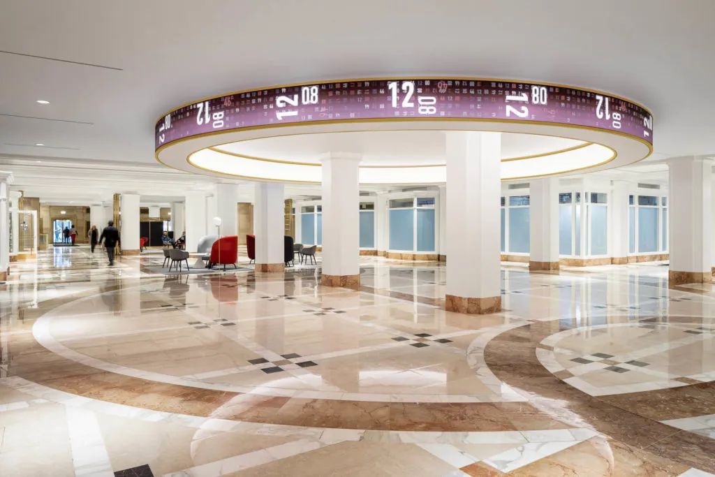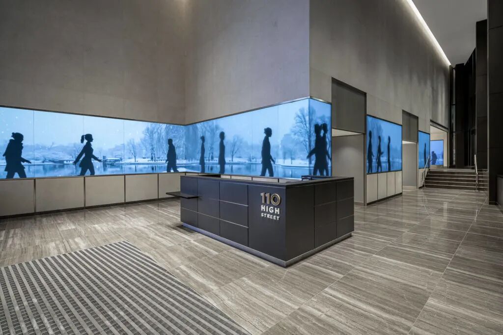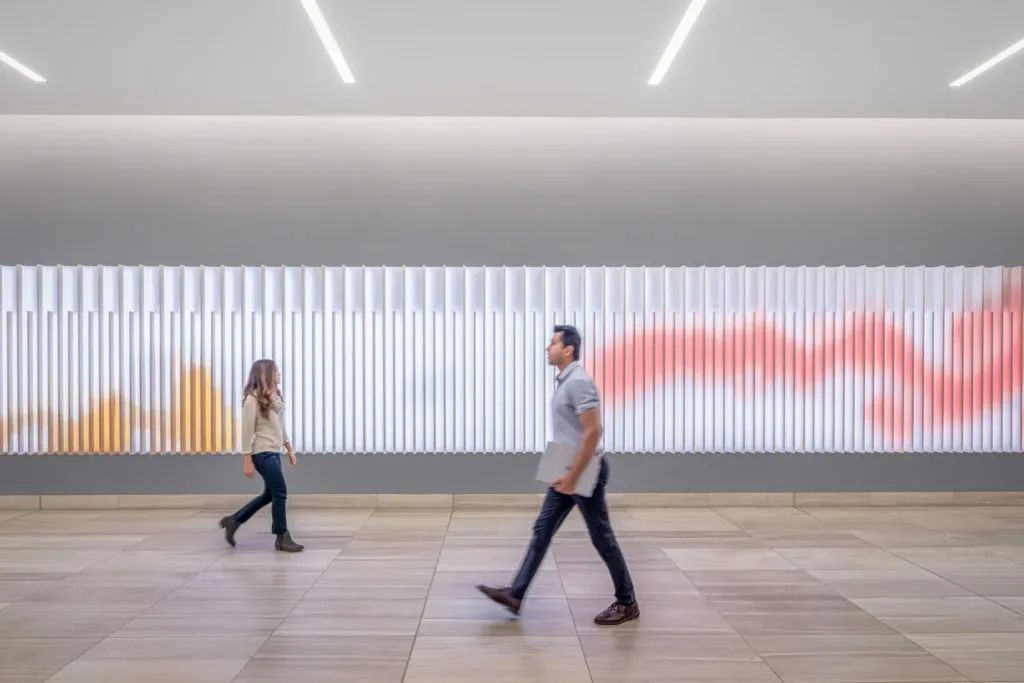 ESI 为大厅设计了一个媒体装置,可以对路人的步伐做出反应,使空间感觉宽敞而充满活力。