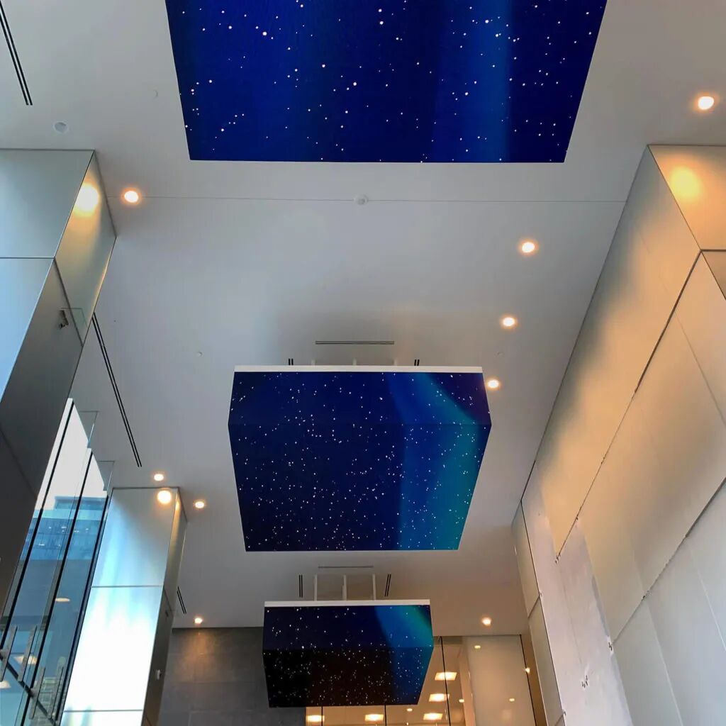 ESI Design 为大厅创造了一个6个悬挂在天花板上的LED盒子。