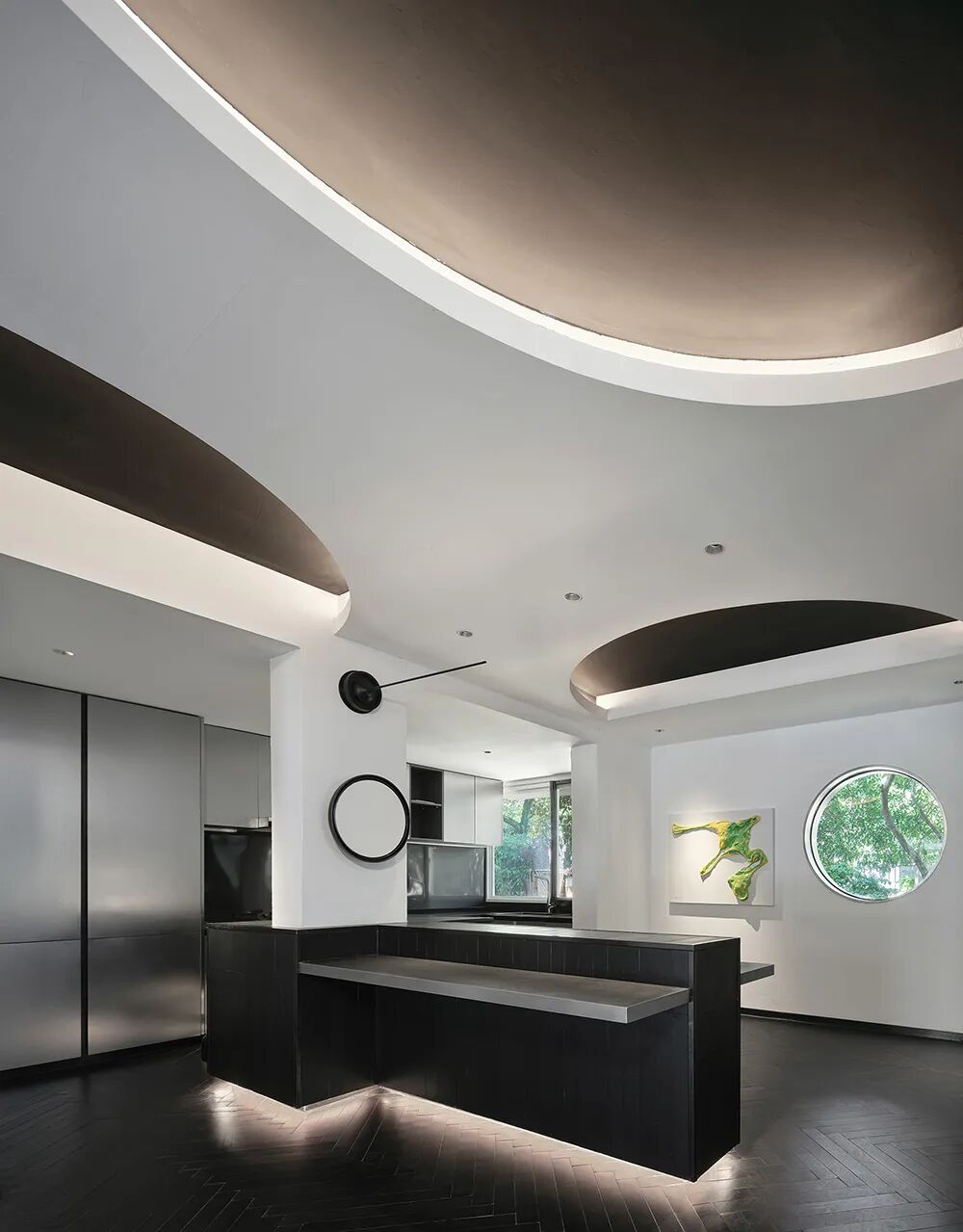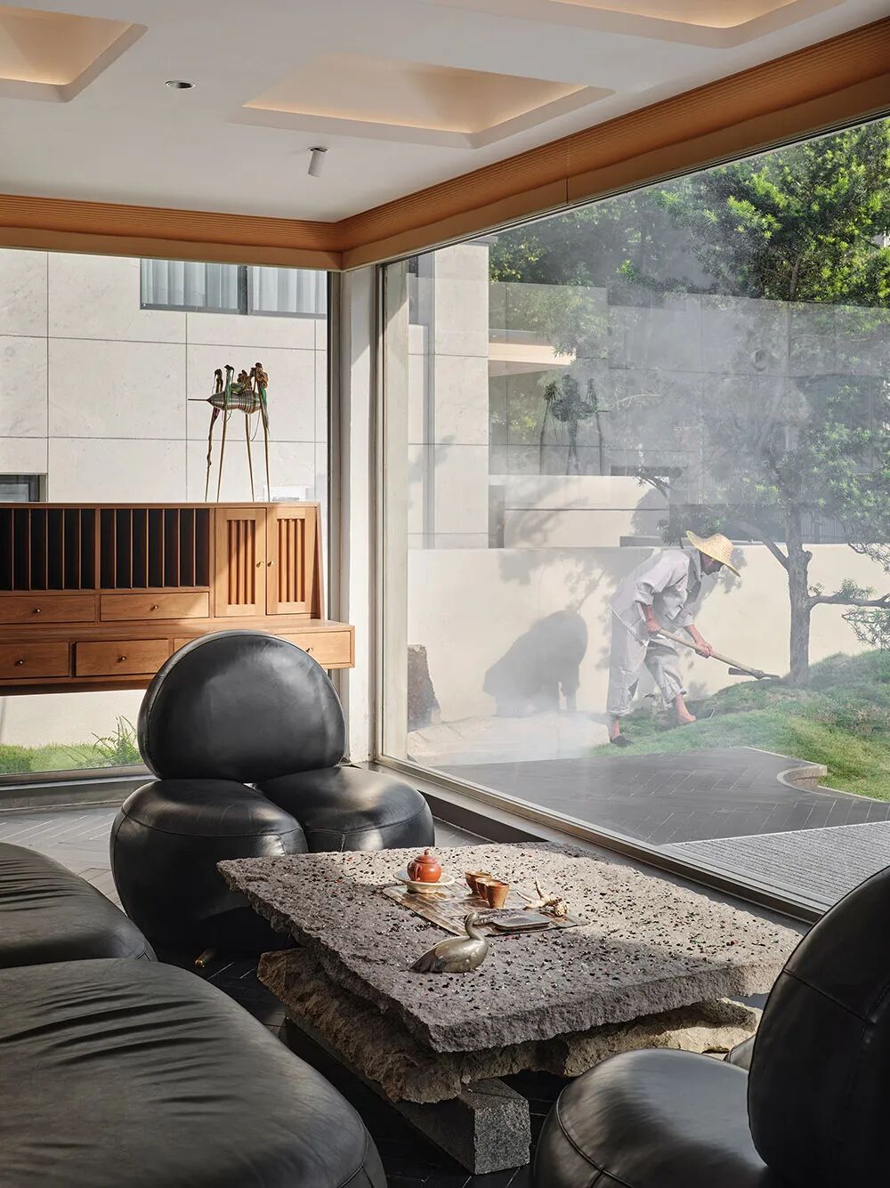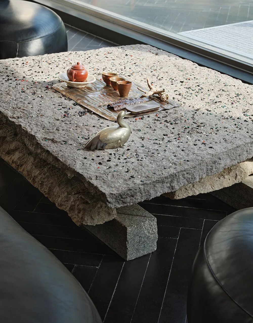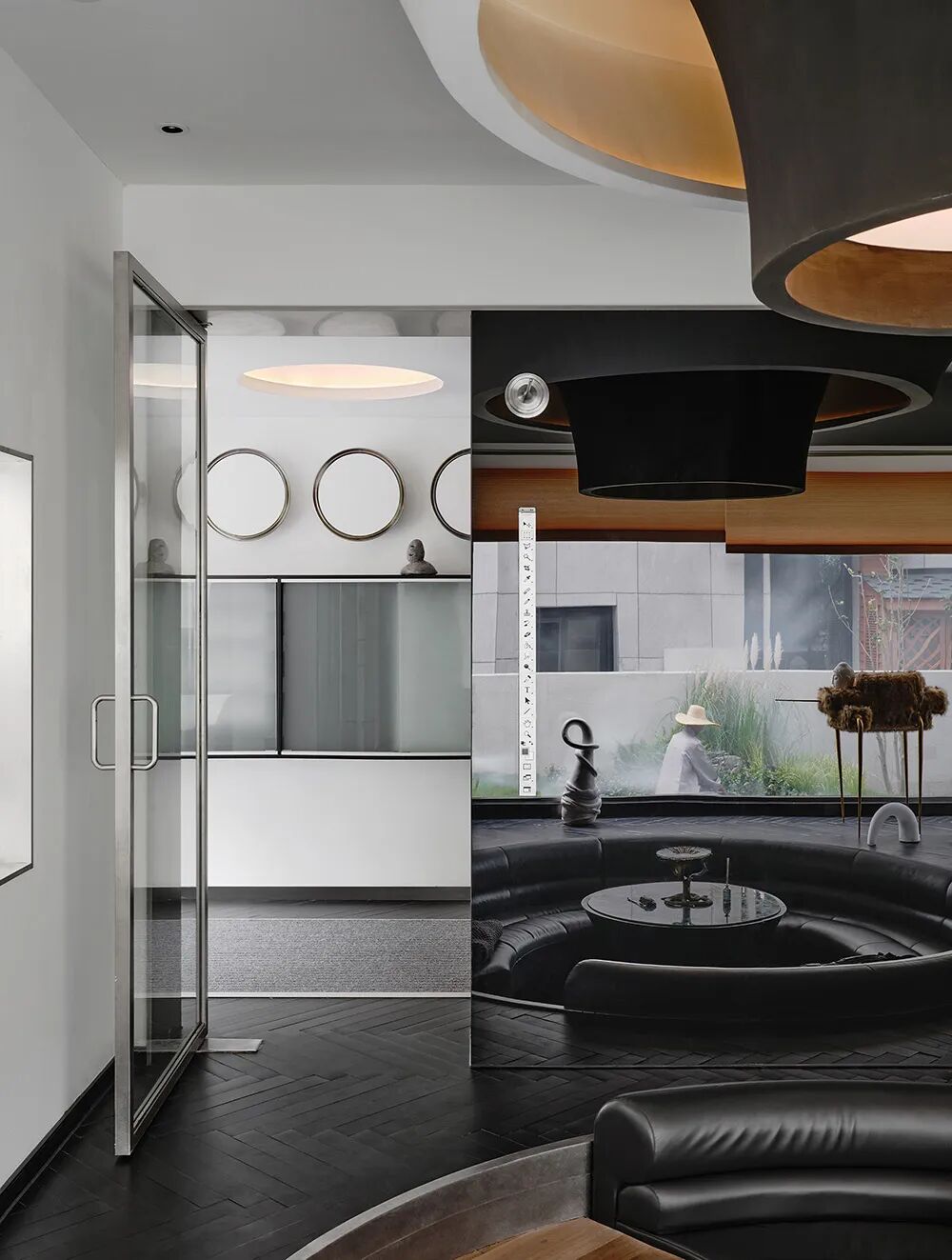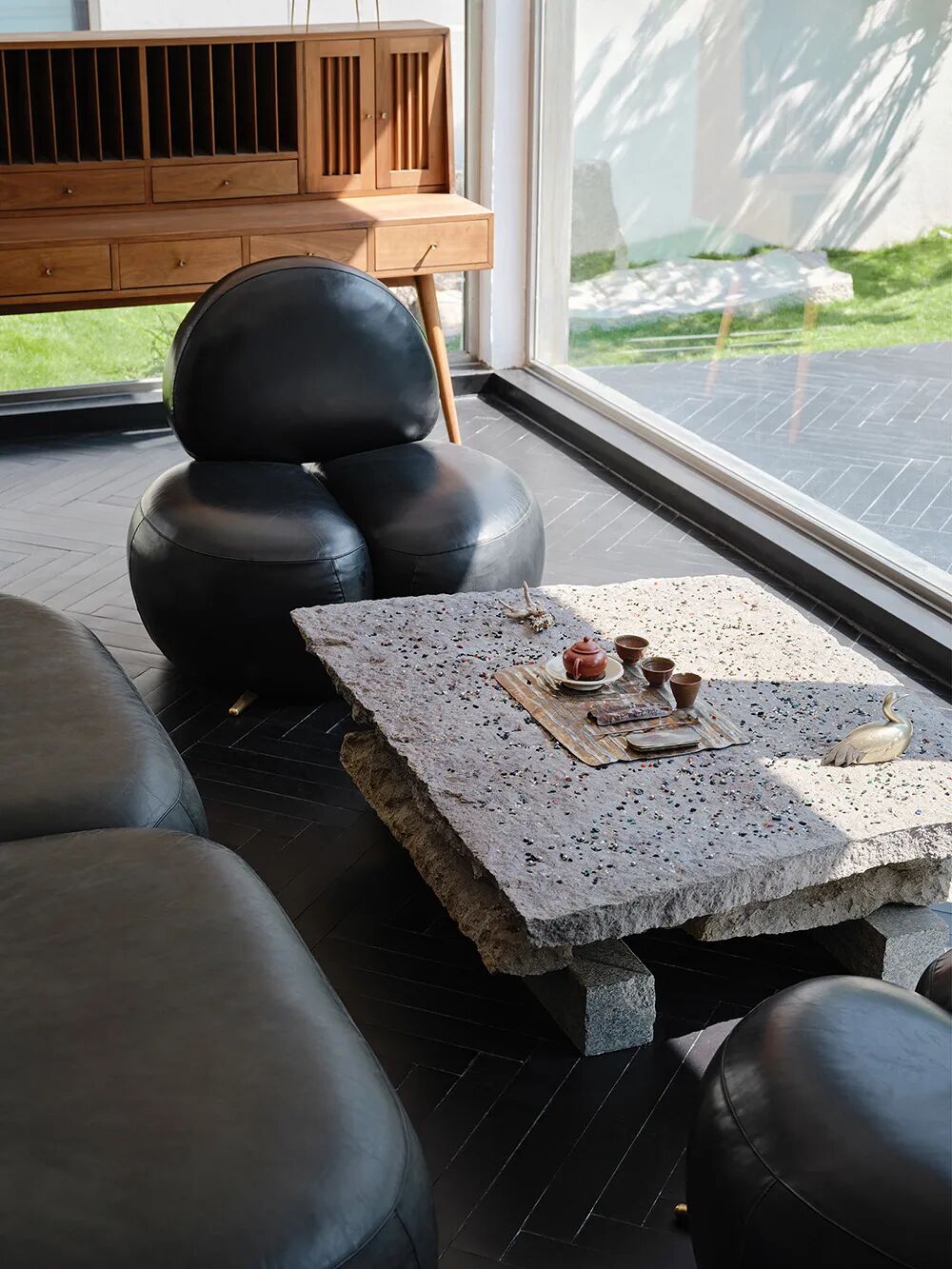 空间的流线与各个方向的露天风景无碍衔连,进门的接待茶室以原石堆叠为桌案,延续着庭院粗粝感的肌理。下挖1m的会议空间中,环状包裹的座位区与弧形的天花造型互相呼应,强化方案讨论时的思维向心力。下沉车库改造成连贯空间的大桌子,充当沉浸式的手作坊。