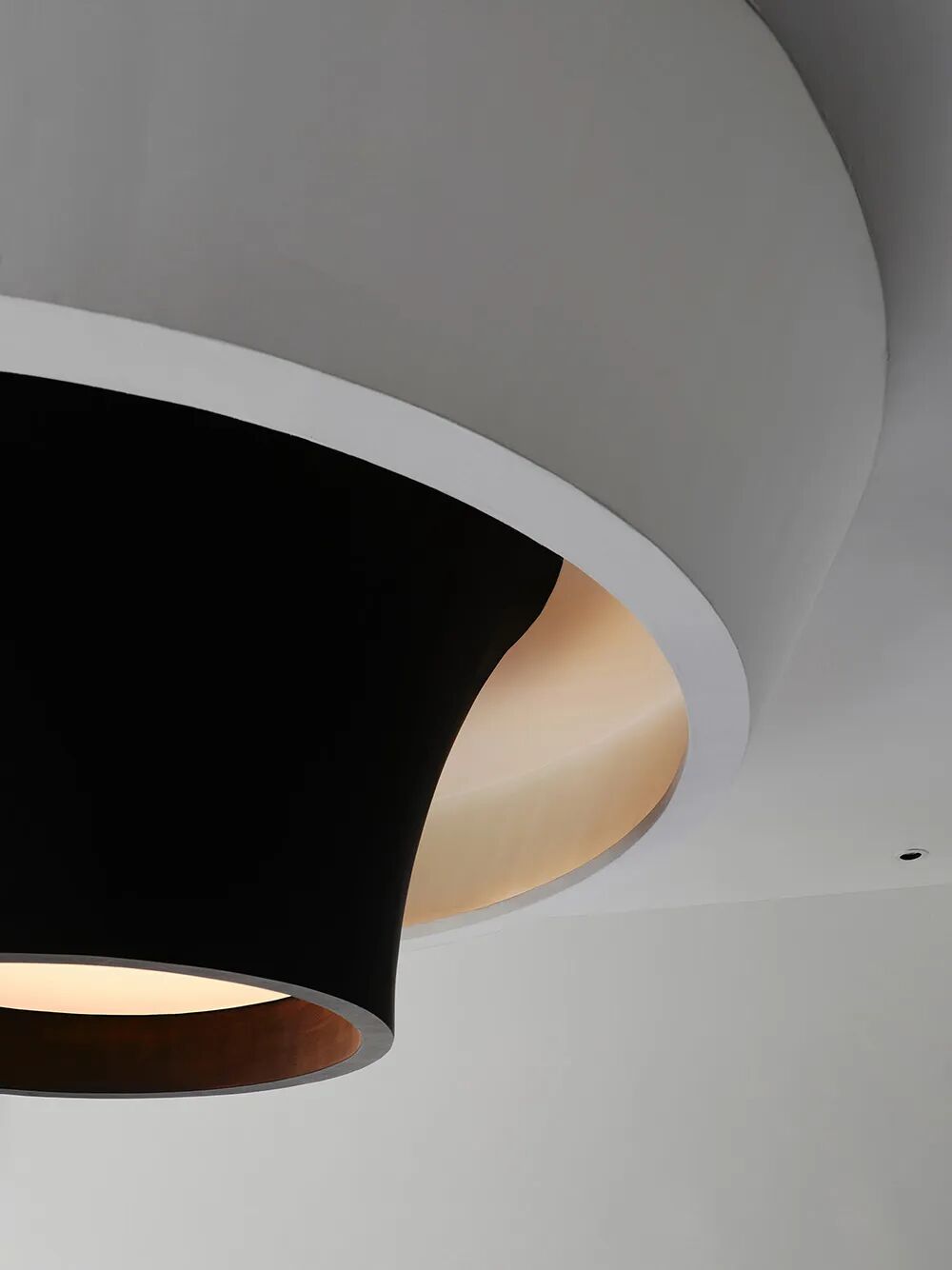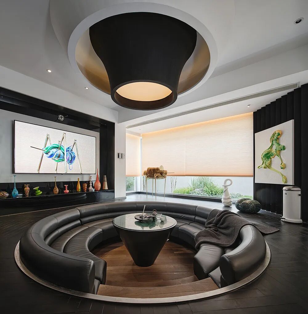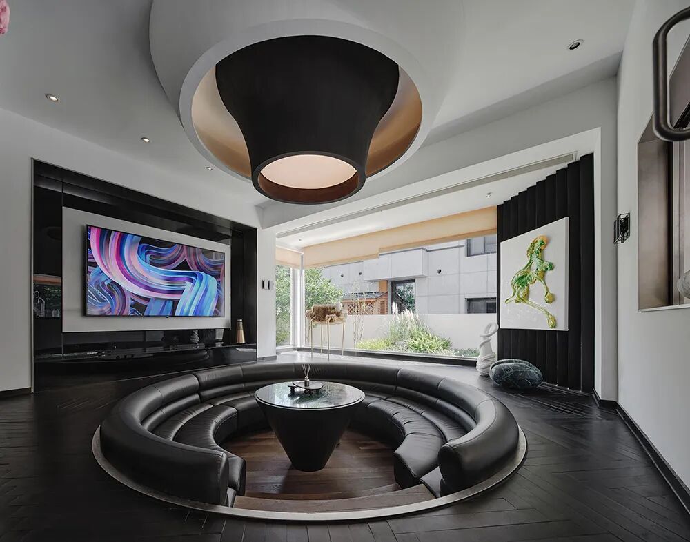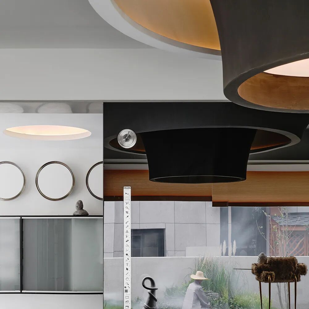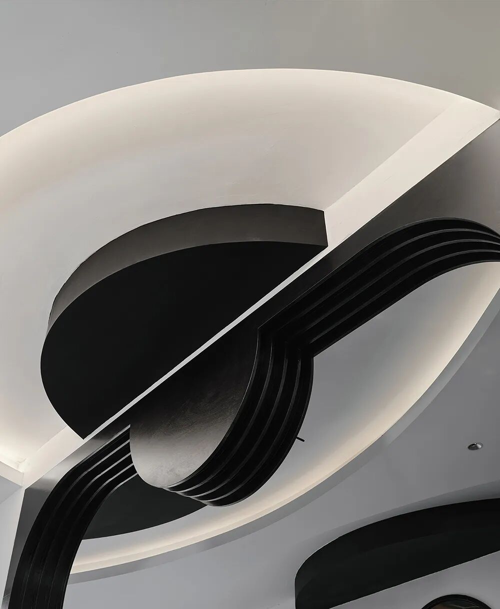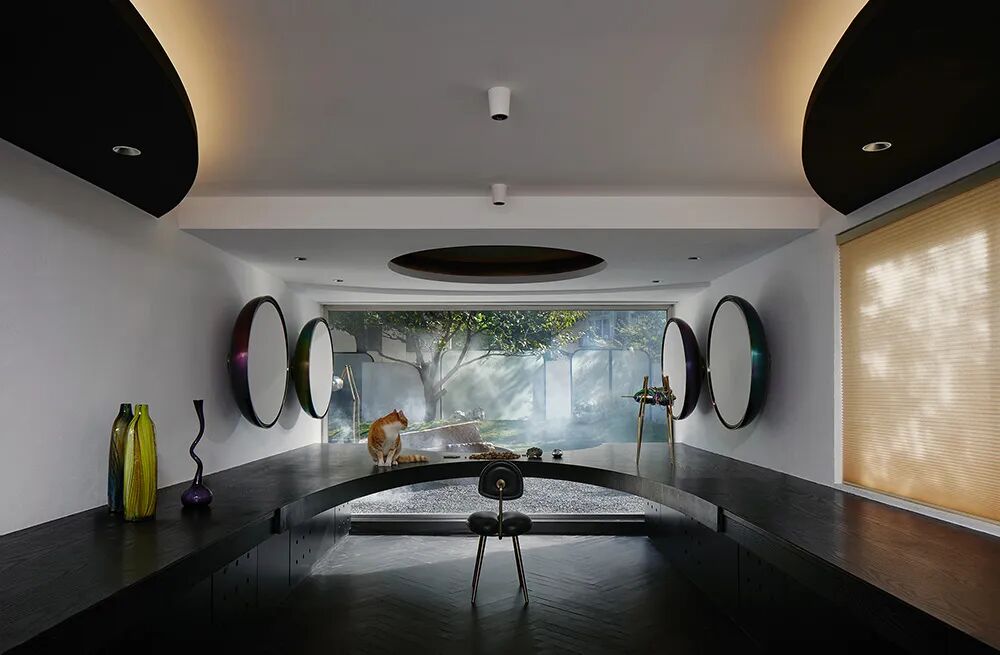 空间的流线与各个方向的露天风景无碍衔连,进门的接待茶室以原石堆叠为桌案,延续着庭院粗粝感的肌理。下挖1m的会议空间中,环状包裹的座位区与弧形的天花造型互相呼应,强化方案讨论时的思维向心力。下沉车库改造成连贯空间的大桌子,充当沉浸式的手作坊。