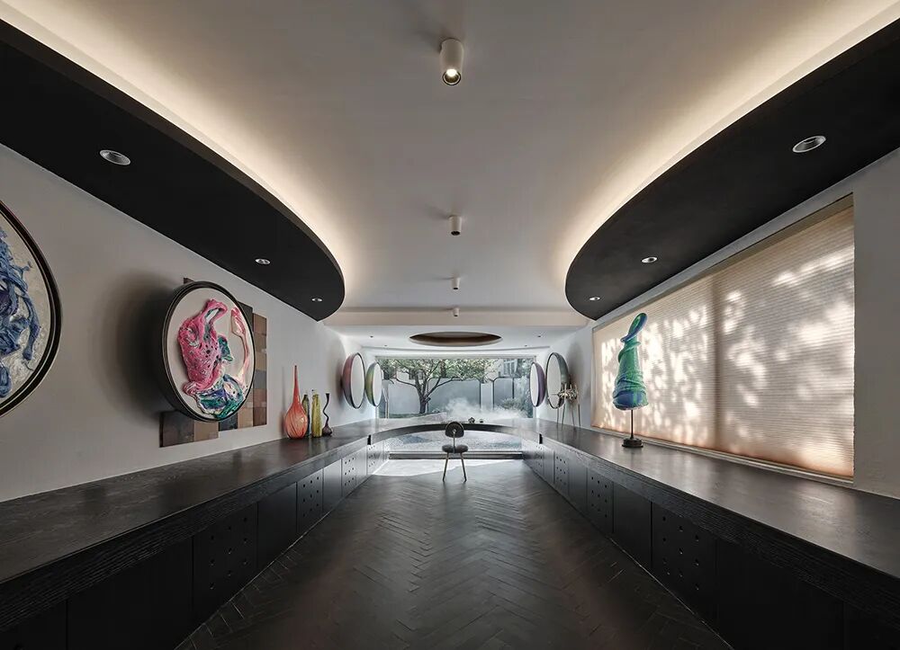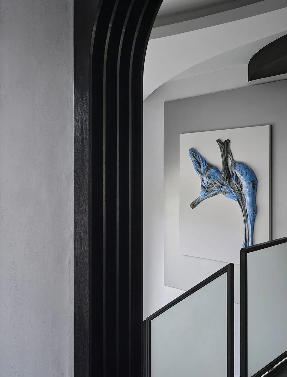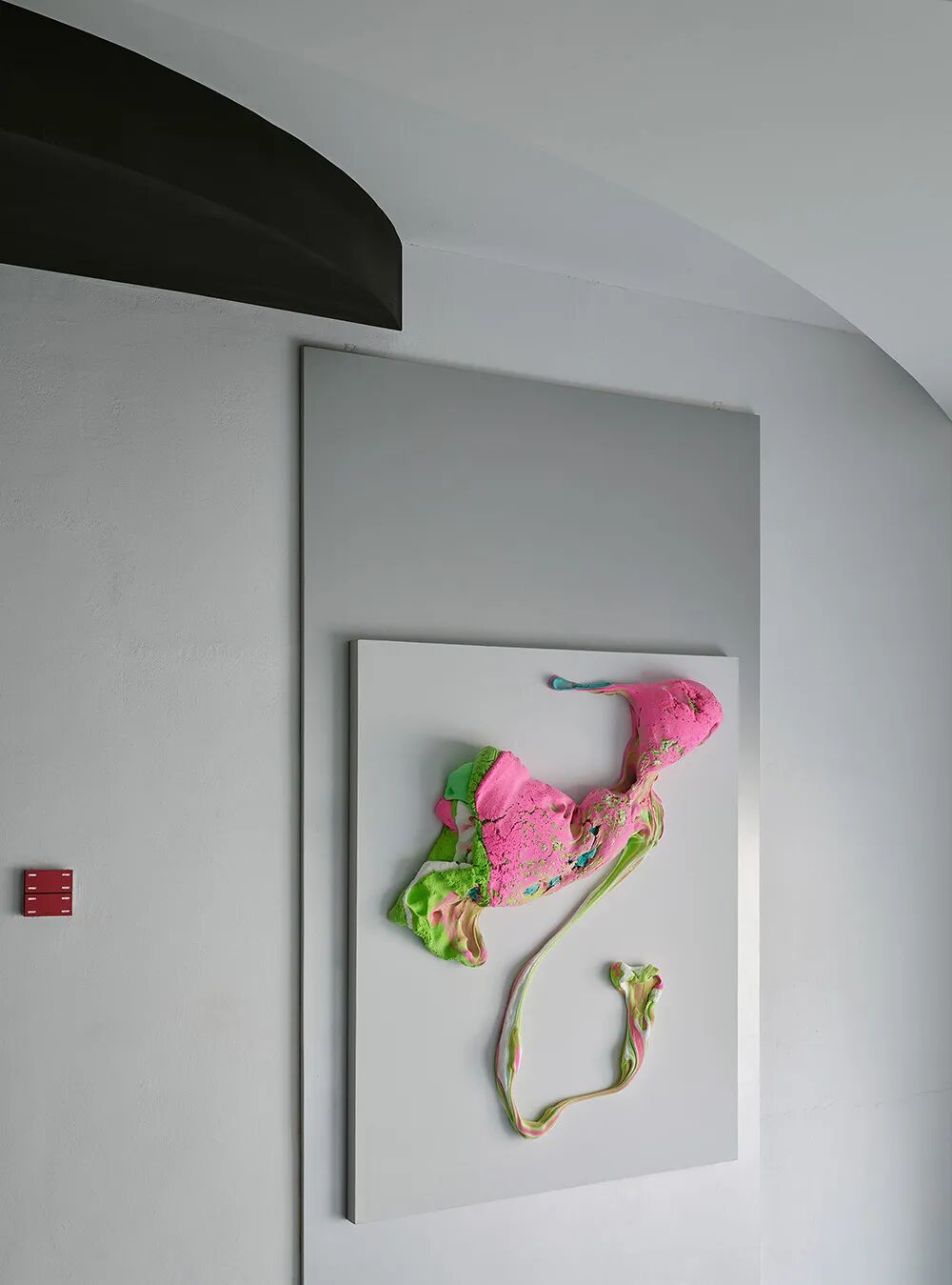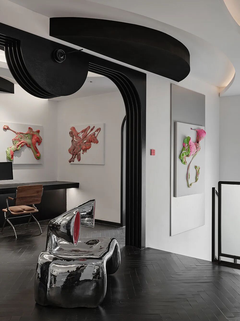 室内的原结构老化,隔间多、通道复杂,导致整体坪效的浪费。但不同于常规解决方案的“开放式”拆改,设计基于对零乱体块的梳理归纳,将重心转移到画廊式的展陈视角,通过“赏画”压缩空间建筑的深度,消解隔墙的体量感,赋予条件不尽理想的空间基础以新的阐释。