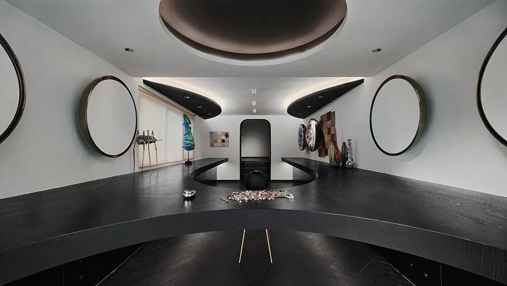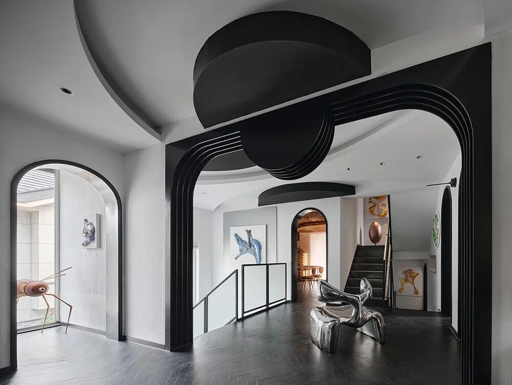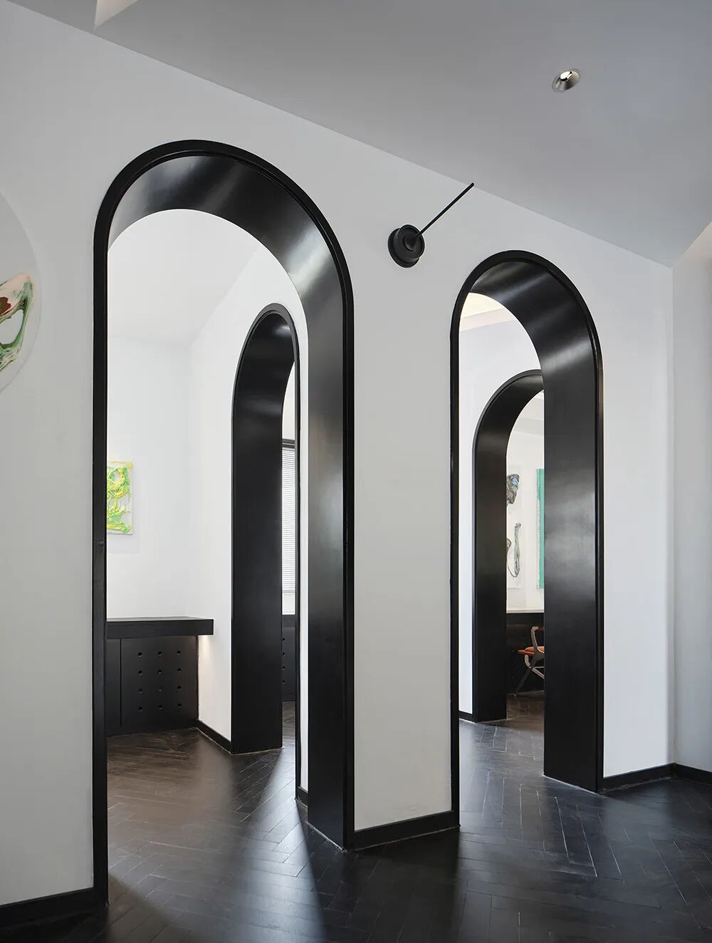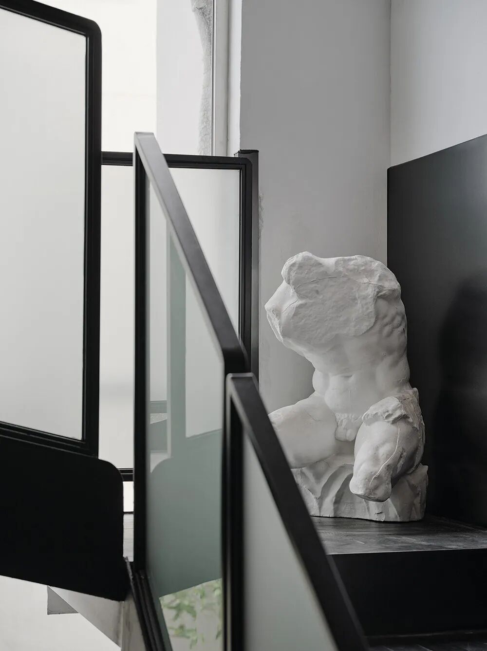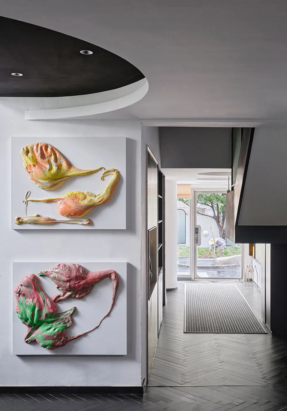 室内的原结构老化,隔间多、通道复杂,导致整体坪效的浪费。但不同于常规解决方案的“开放式”拆改,设计基于对零乱体块的梳理归纳,将重心转移到画廊式的展陈视角,通过“赏画”压缩空间建筑的深度,消解隔墙的体量感,赋予条件不尽理想的空间基础以新的阐释。