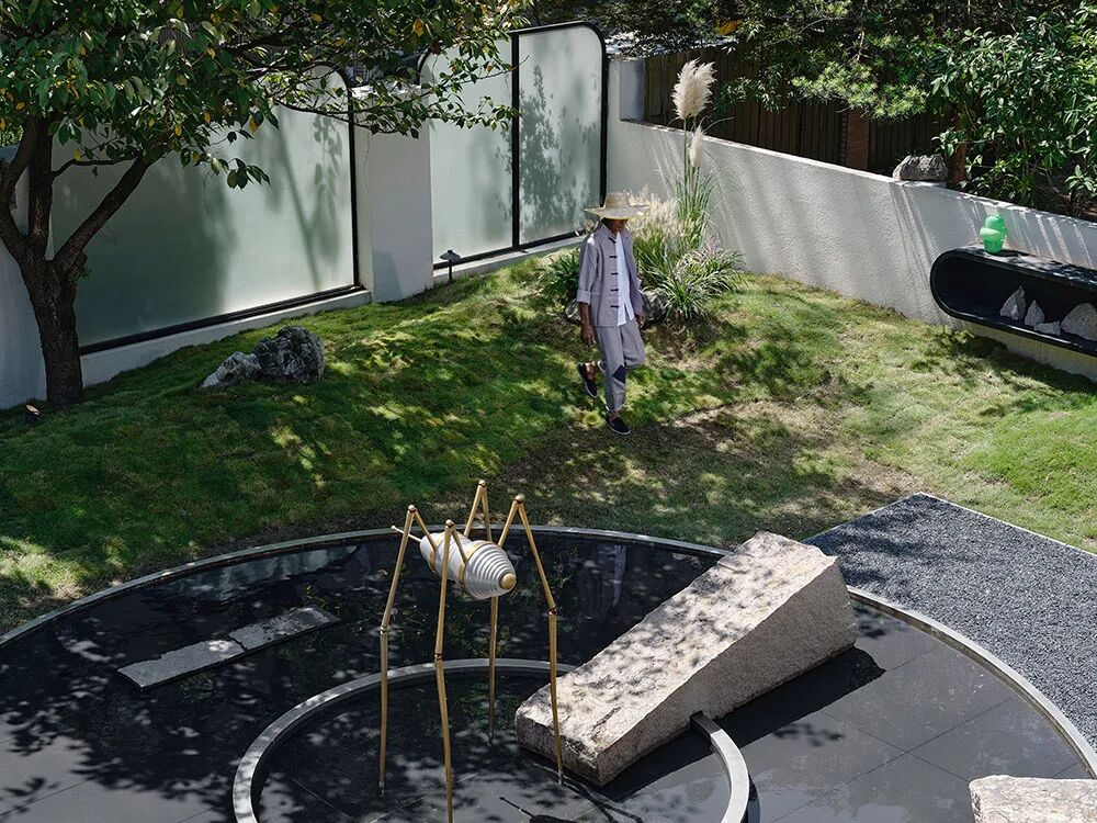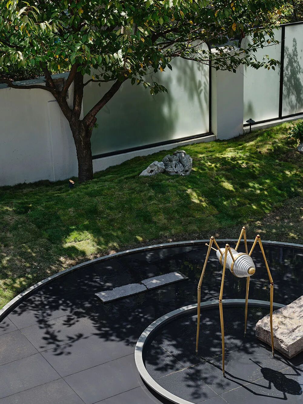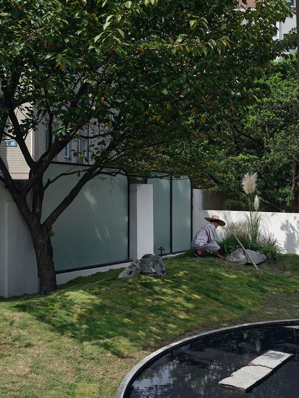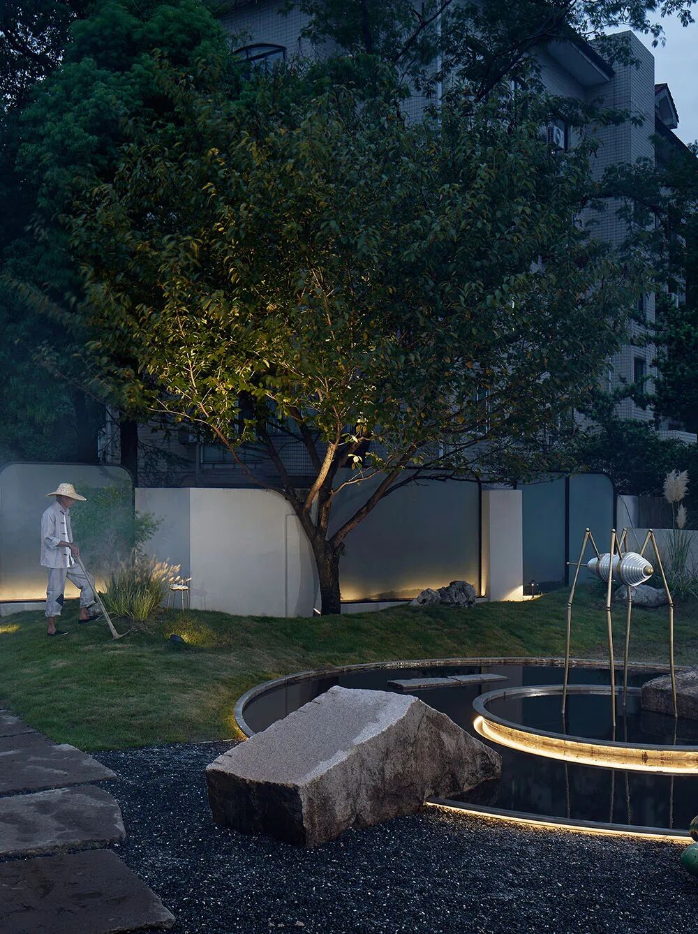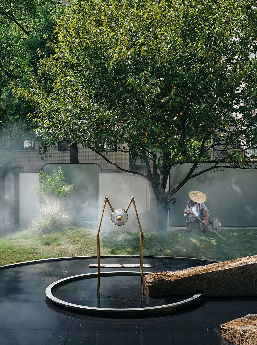 在这方山水的中心,开辟出一个环形的浅池,内圈与外圈构成同心圆的叠层,分布于池水、砾石、土壤、草坪的四块巨型荒料石与之两两咬合,寓意多元要素的互补共生,又谙合计时指针的坐标轴,将“时间”引入场景剧情。而无论创作抑或耕作,最奢侈的正是时间的等待。