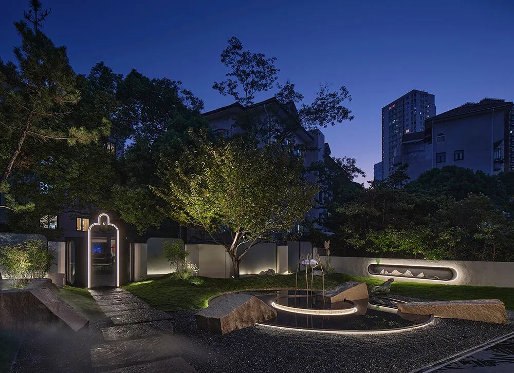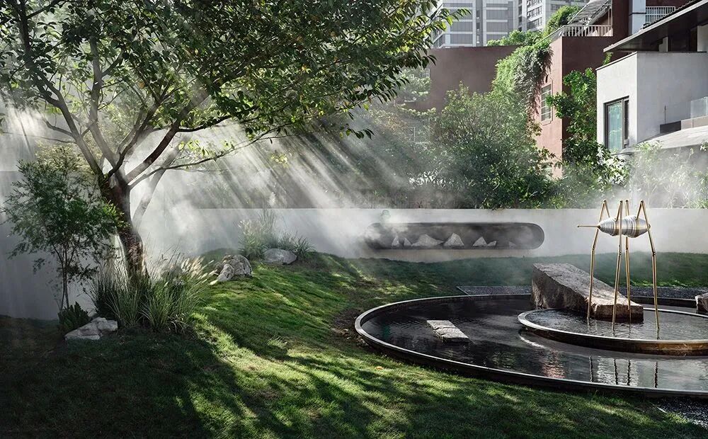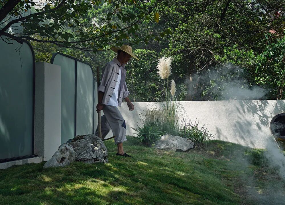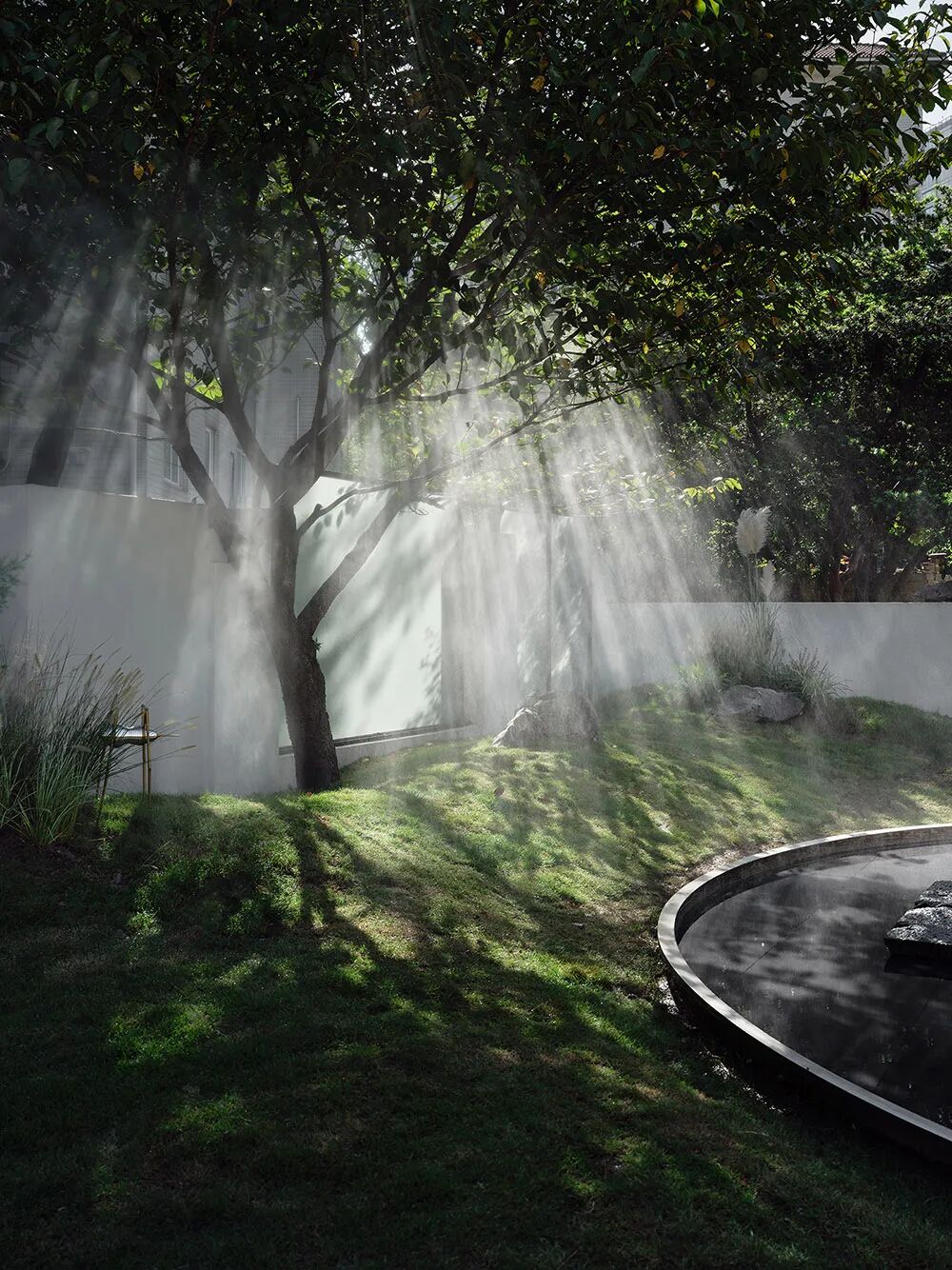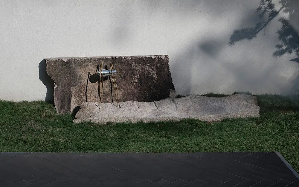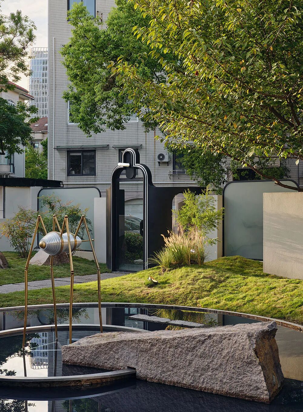 在这方山水的中心,开辟出一个环形的浅池,内圈与外圈构成同心圆的叠层,分布于池水、砾石、土壤、草坪的四块巨型荒料石与之两两咬合,寓意多元要素的互补共生,又谙合计时指针的坐标轴,将“时间”引入场景剧情。而无论创作抑或耕作,最奢侈的正是时间的等待。