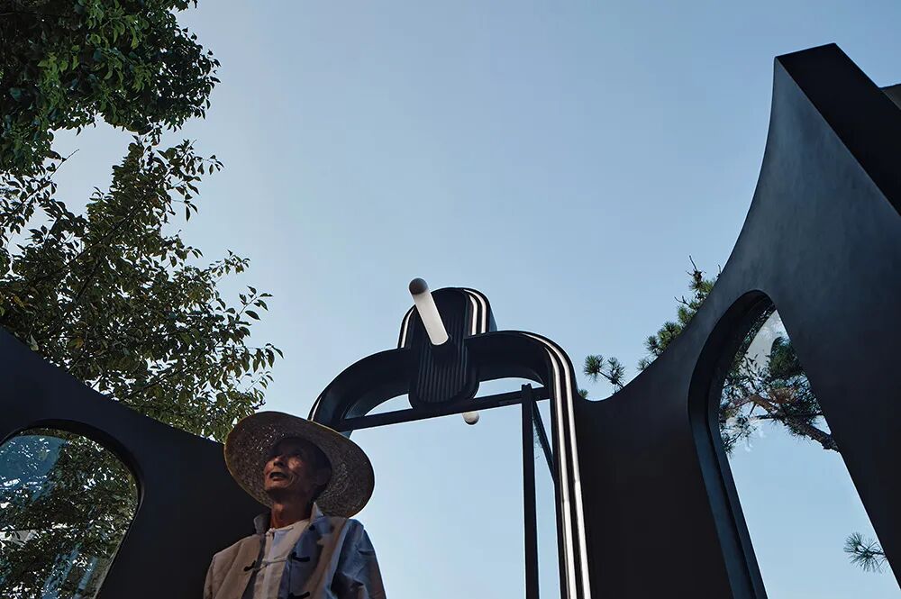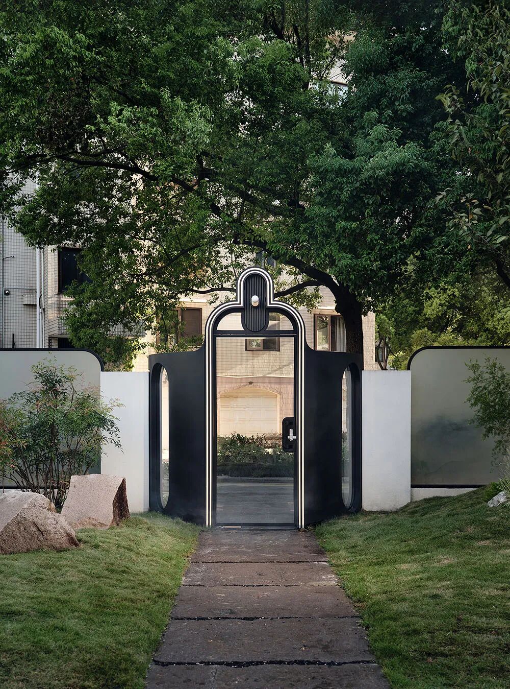 院子入口以退让的方式围合谦逊的开敞尺度,900mm宽的大门隐现幽然氛围。PIG DESIGN标志性的幽默感,这一次回归于自我调侃:异形门头在与建筑体的构图关系中,神似“小猪”的五官简笔,而以廉价的PVC管喷黑排列的屋顶,则是“四六分”的小猪发型。