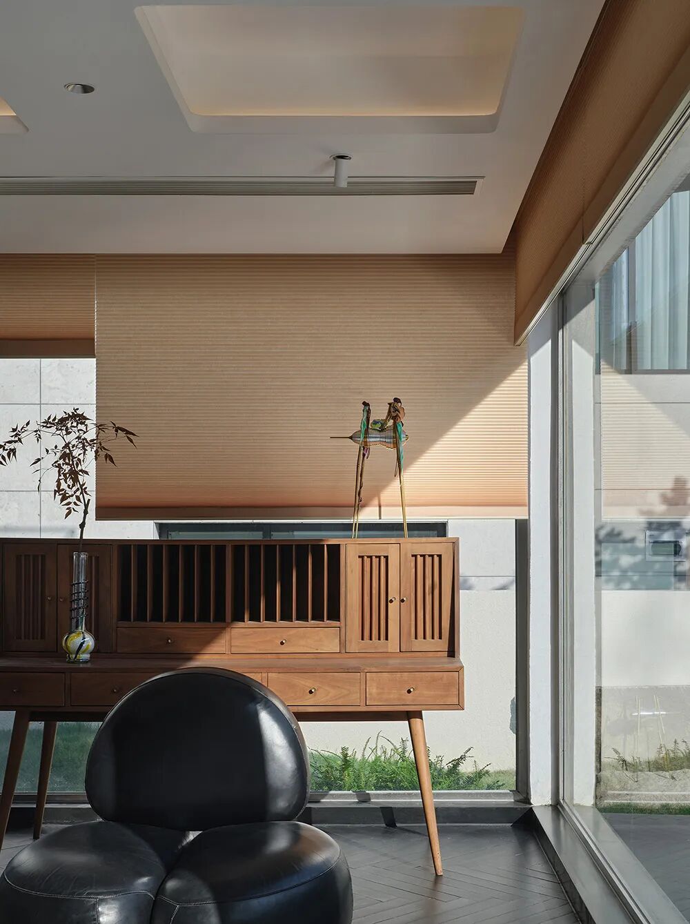已逾二十三年房龄的原建筑,无论立面的语汇还是平面布局上,都抹不去停留在90年代的“过时”烙印。设计却以尽简和可续的介入,大致维持主体结构的现有状态而未做太多改动,仅在外墙植入数面落地玻璃窗,从建筑、空间、景观的关联维度,模糊内外边界。