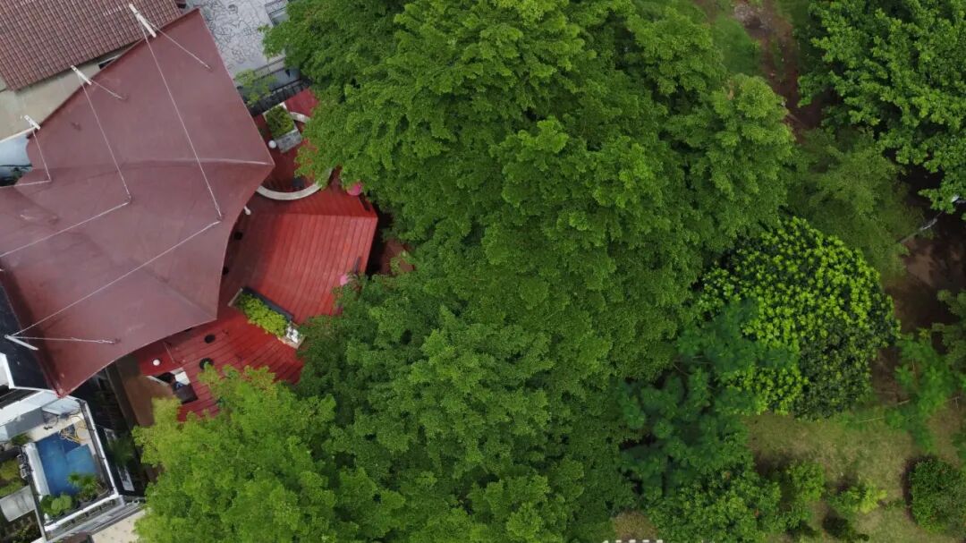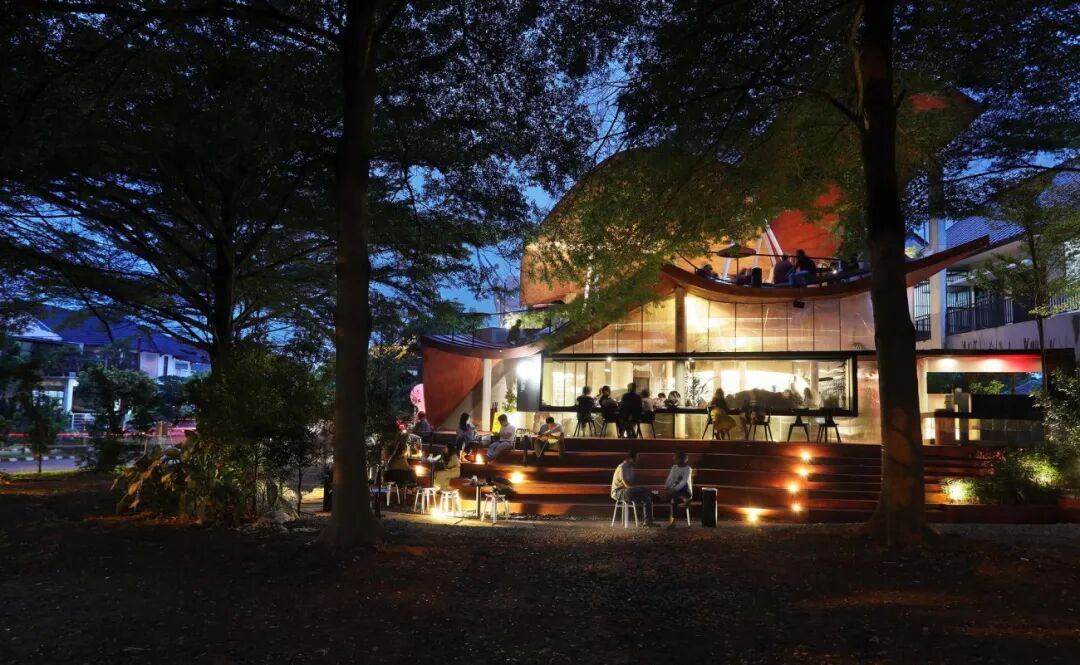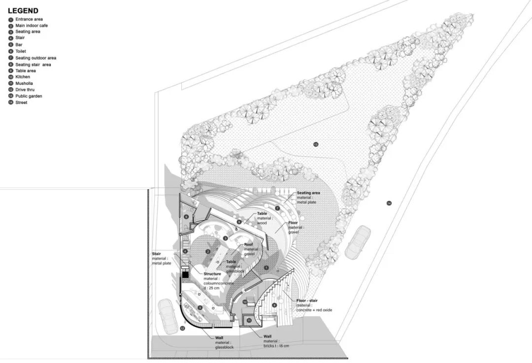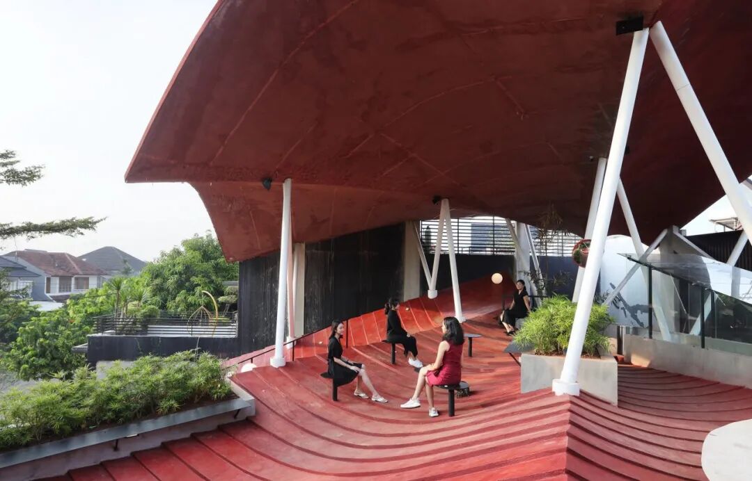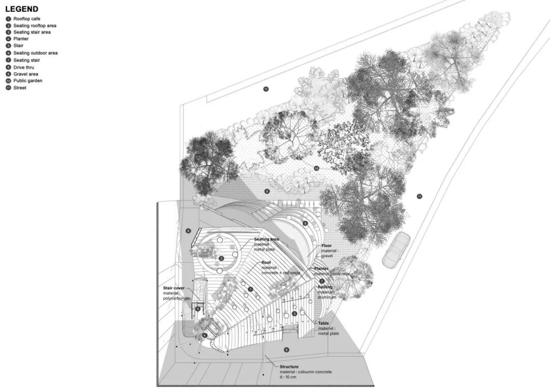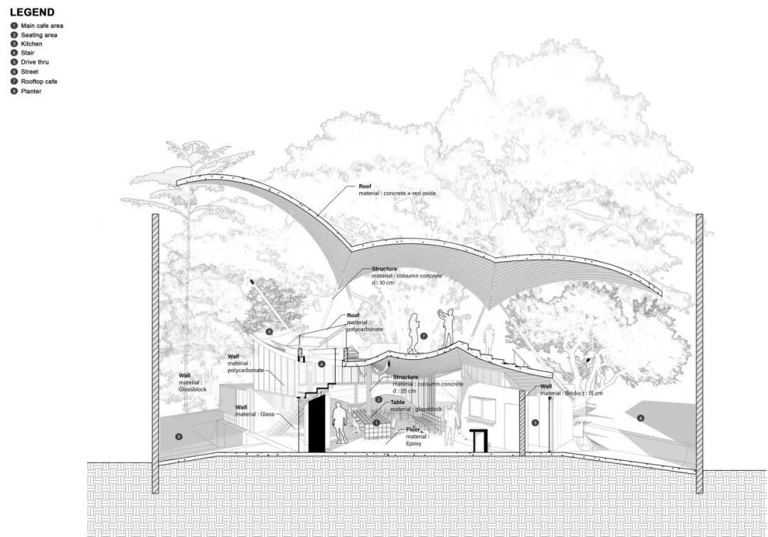 树冠花园咖啡厅是一座商业花园,位于Bekasi(35摄氏度)高温环境下的紧凑型住宅的中间,与许多其他实验性 的Tanatap 商业花园设计一样,使用这个特定位置来证明这一点,即无论场地环境如何,被动式低能耗商业设计在热带区域国家仍然可以实现并有利可图。
