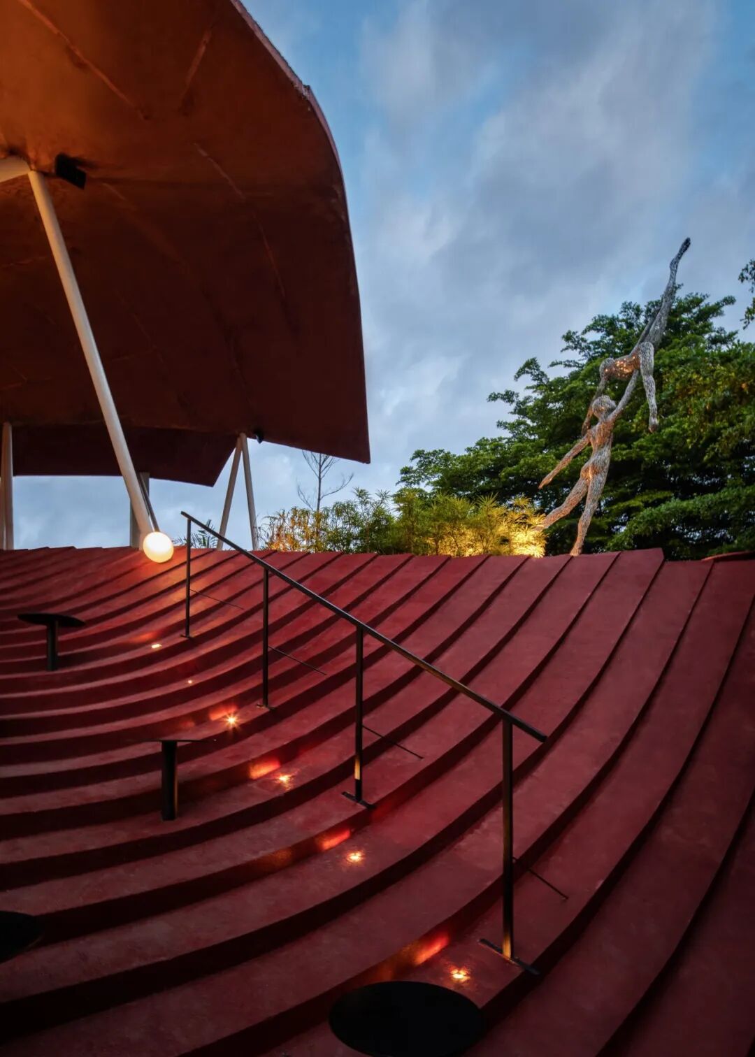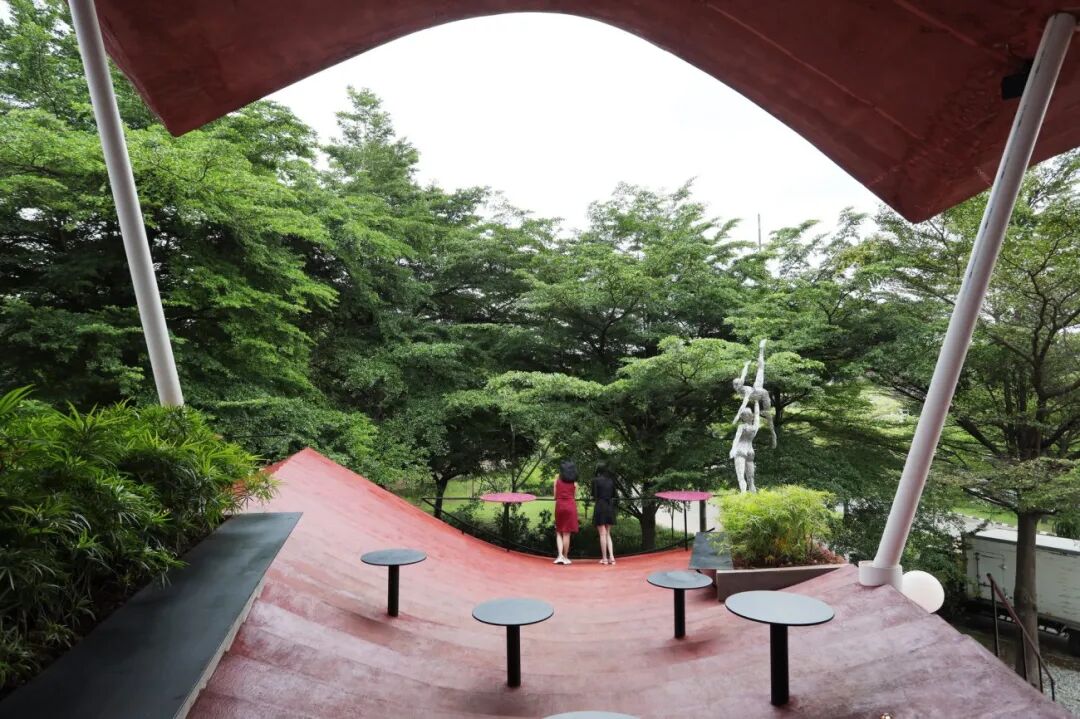 两层楼的多轴着色混凝土元素和半透明元素的并置增强了热带杏仁花园的外部景观,使这个优雅的聚集空间成为休息、放松的完美场所。
