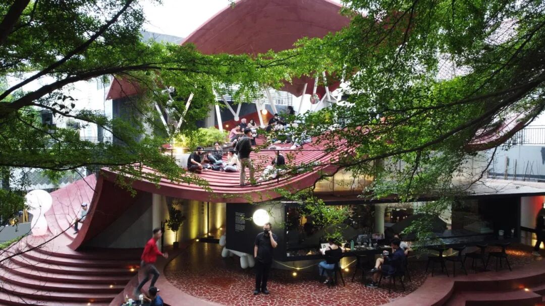 RAD+ar has been optimized for a bespoke experimental tropical experience. The inside-outside concept is integrated by series of shades of the floating concrete that casted a different ambience every hour, achieved by seamlessly extending the roof-ceiling elements touching the existing tree canopies, invites for a unique experience for visitors to dance among the tropical almond canopies. The open layout creates an efficient interior unit flow and interaction of the bar area, communal table and circulations.