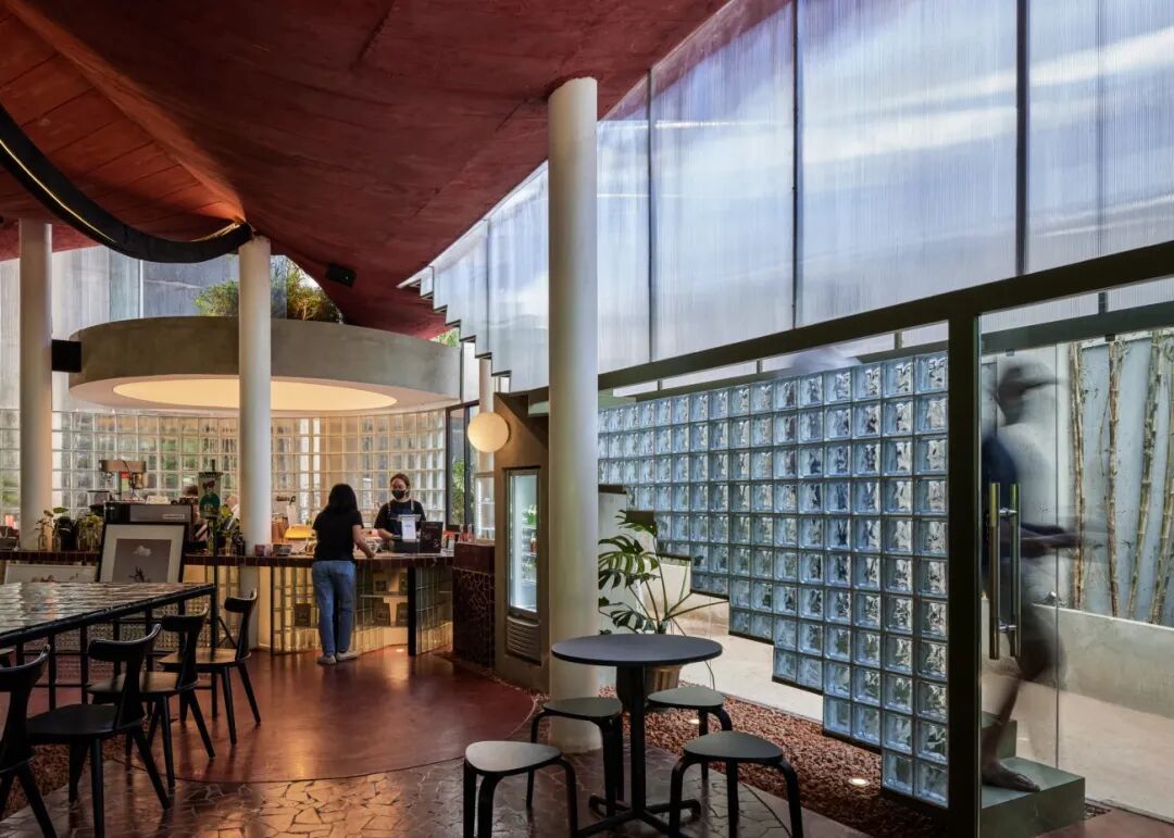 RAD+ar 已针对定制的实验性热带体验进行了优化。咖啡厅室内外的概念由一系列漂浮混凝土的阴影融合在一起,每小时营造出不同的氛围,通过无缝延伸接触现有树冠的屋顶天花板元素实现,为游客带来独特的体验,让他们在顶棚下的热带风情中翩翩起舞。开放式布局创造了高效的室内空间流动以及酒吧区、公共餐桌和流线的互动。
