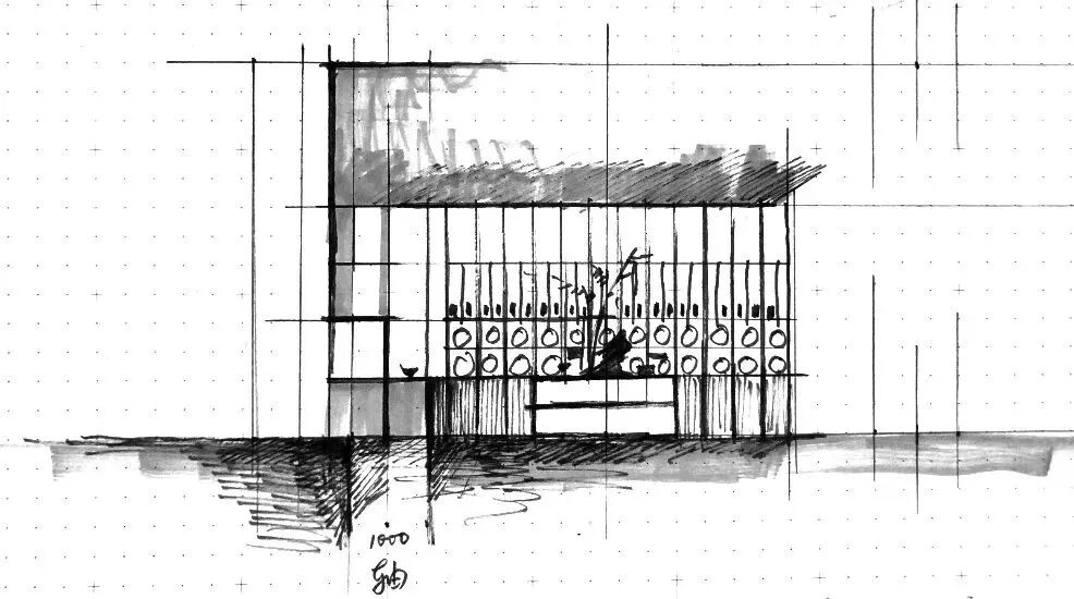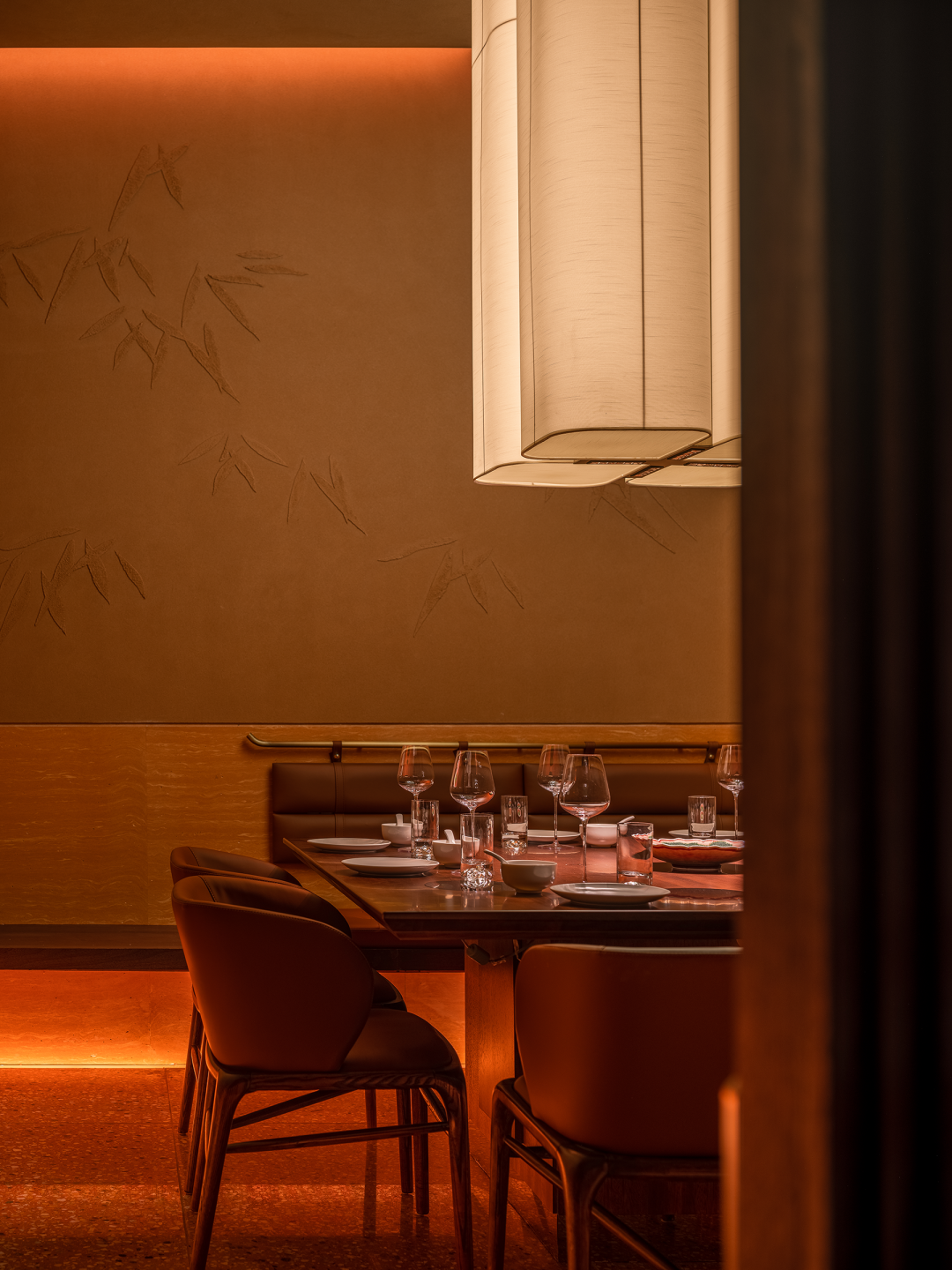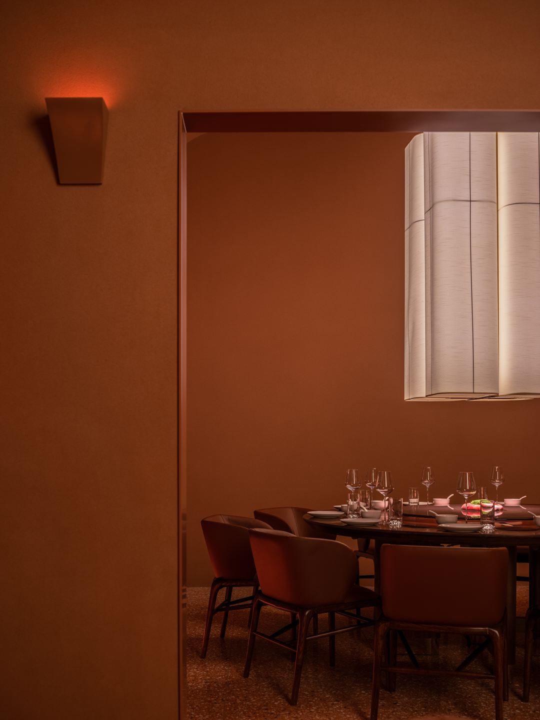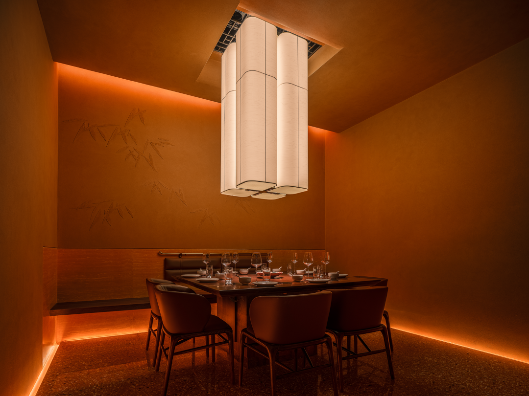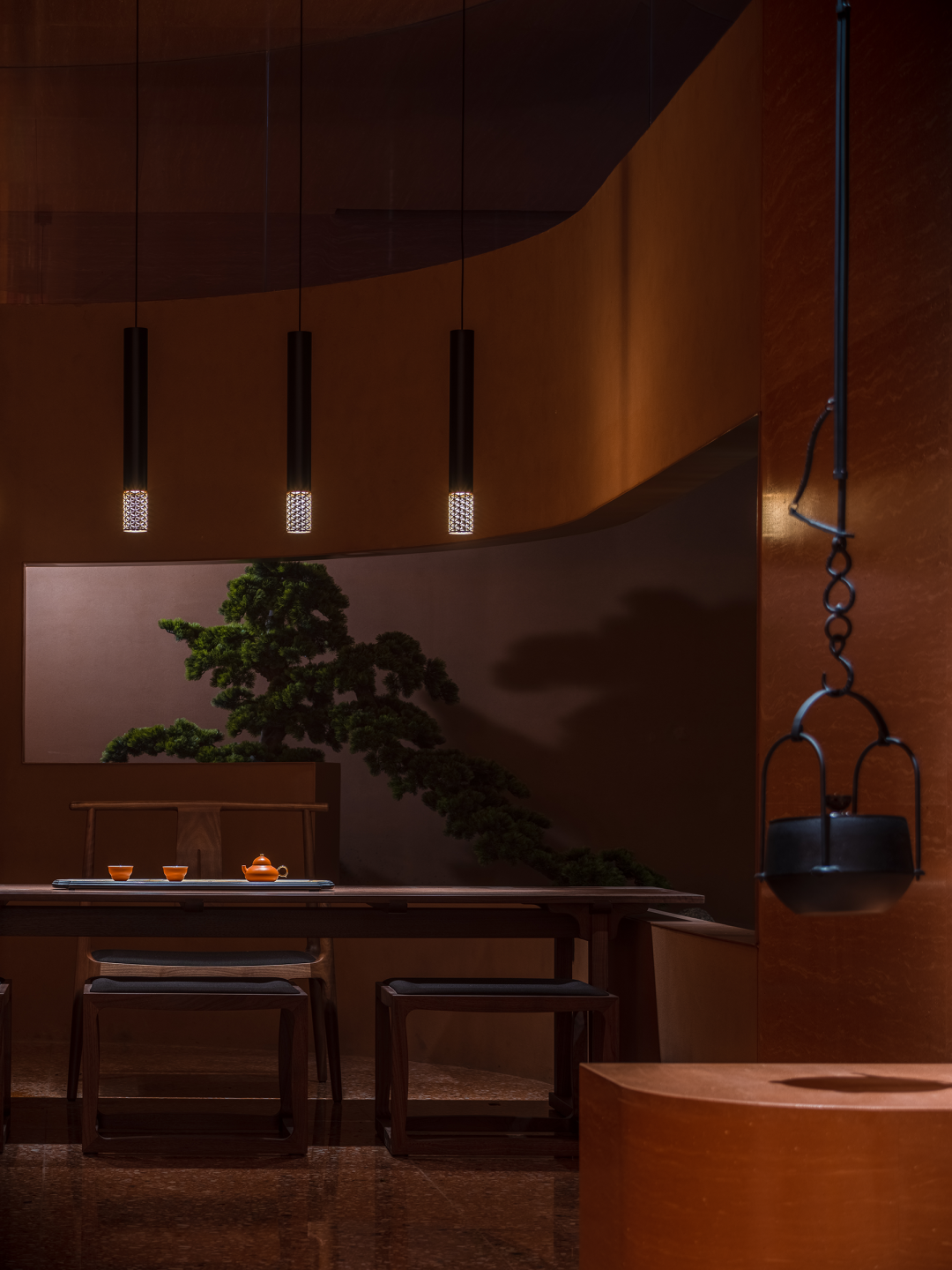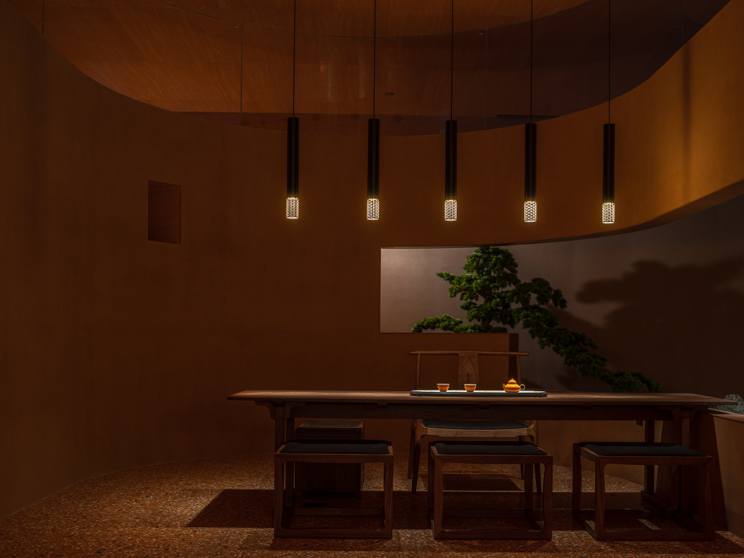 入口左侧有一间茶室,承接入口的弧面,围合出半圆形的小空间,其功用可与餐复合,配合经营也可单独成席,品茶悟道。