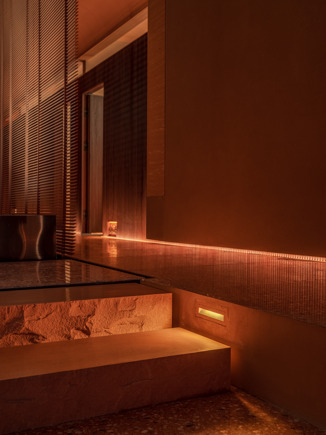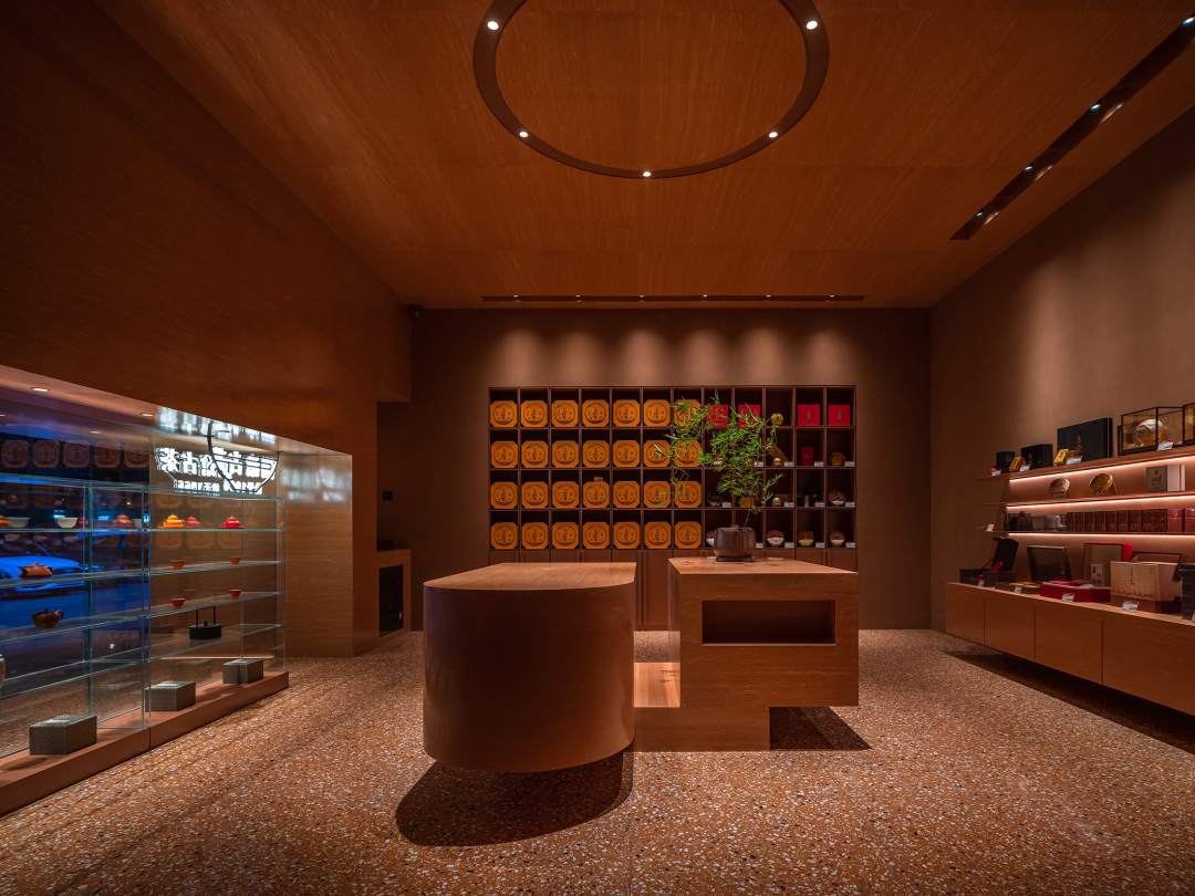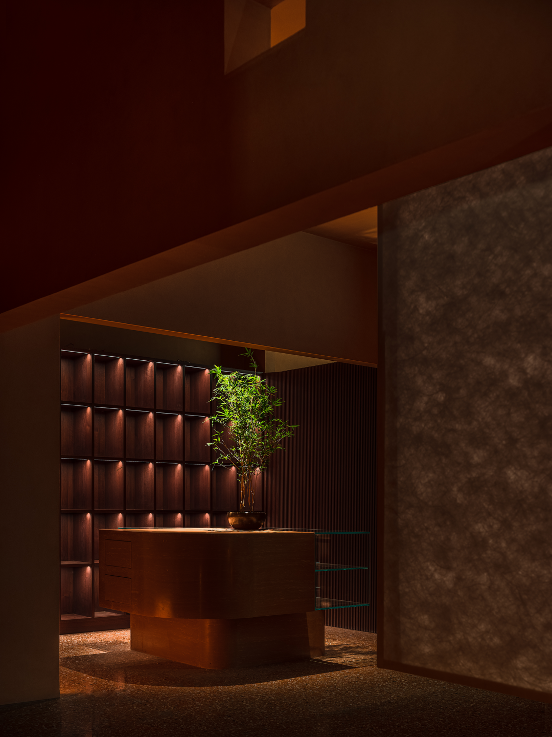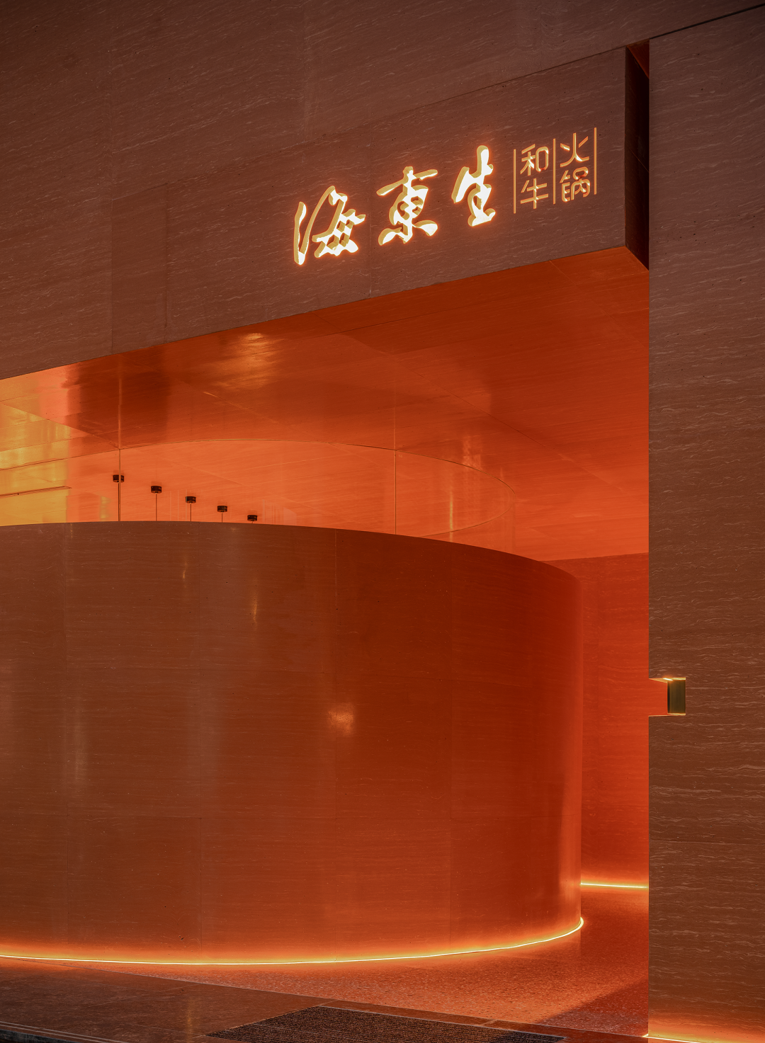 餐饮品牌海东生,既可围炉火锅,又可品茶。透过低矮的橱窗,设计师将茶的部分显现;一条“缝隙”的细窗,对内,是光的入口,对外,是夜色中的明灯幽玄的弧形入口,以一种裹挟的势能,引人探寻。