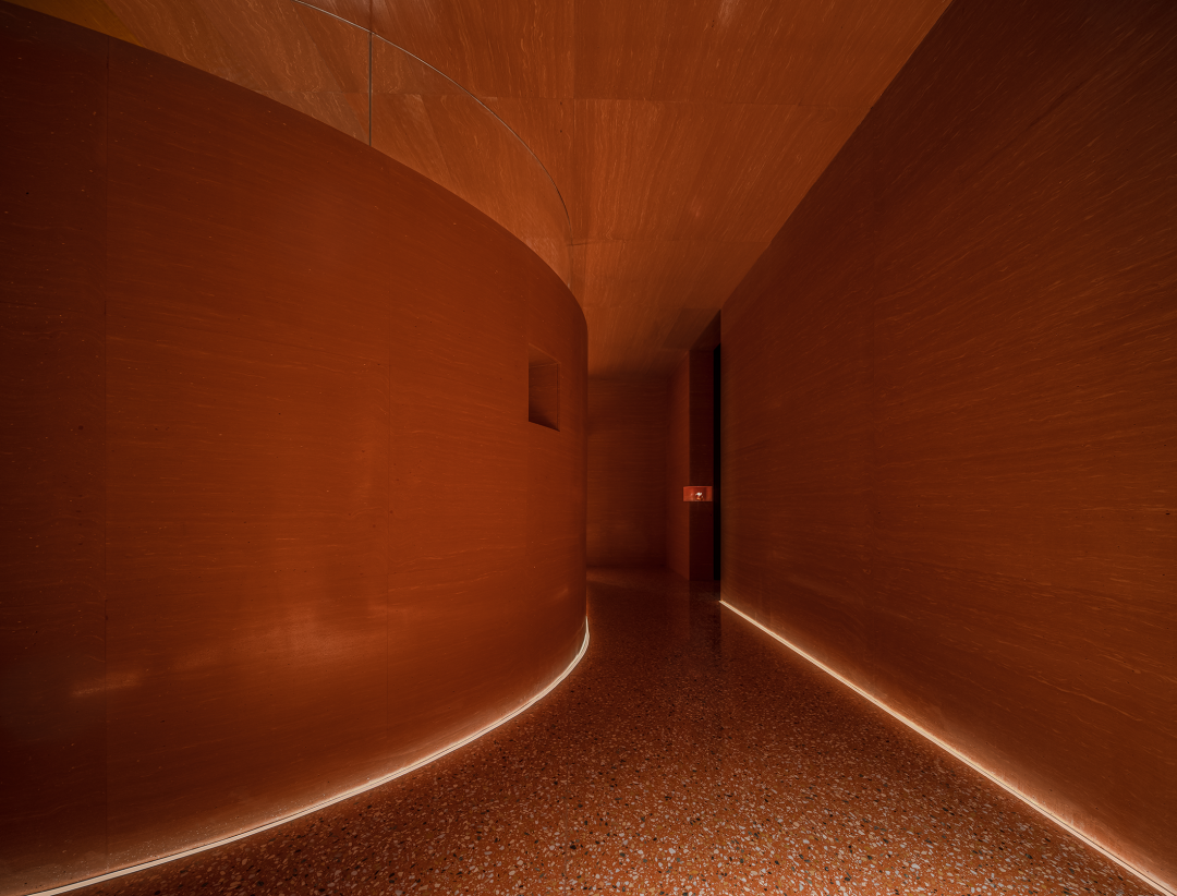 在外立面材料的选择上,设计师选择了暖红色洞石。洞石这种材质,由于表面不均匀的孔隙和纹理,不仅合乎北方的粗砺,又传达出古朴的自然气息。