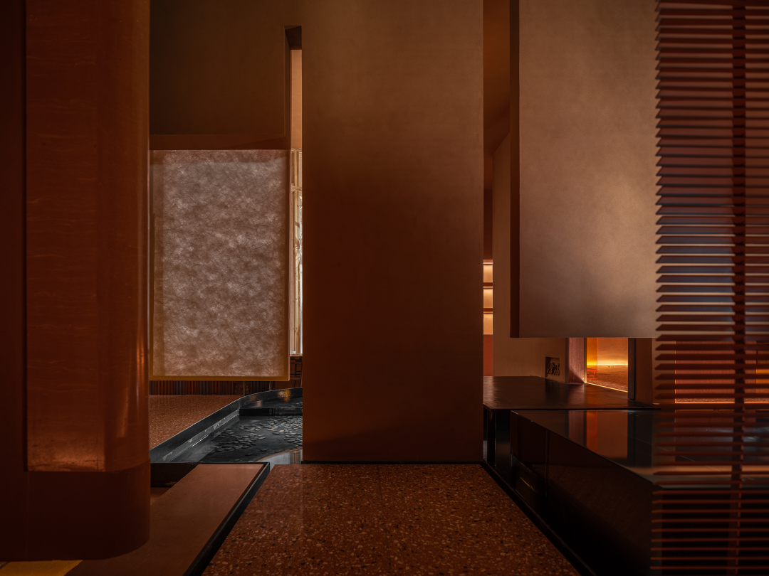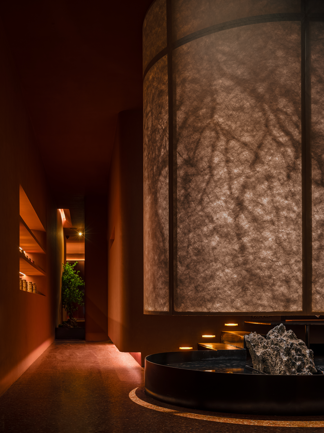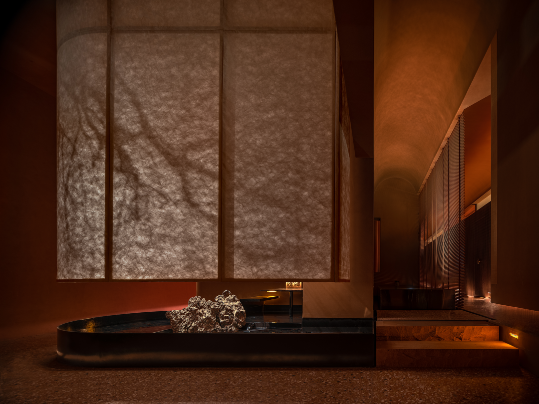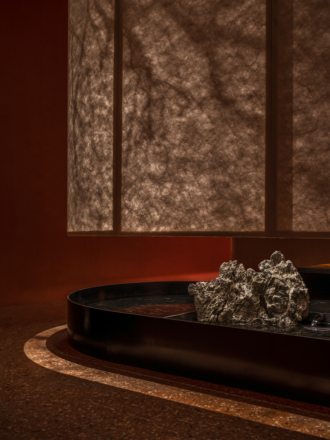 屏风使用杜邦纸材质,有意将萧瑟朦胧三分,增添东方的含蓄、静谧,结合地面的水、石,组合出一幅虚实相映的“室外”景观。穿过这里,风声渐去,只闻人语响。