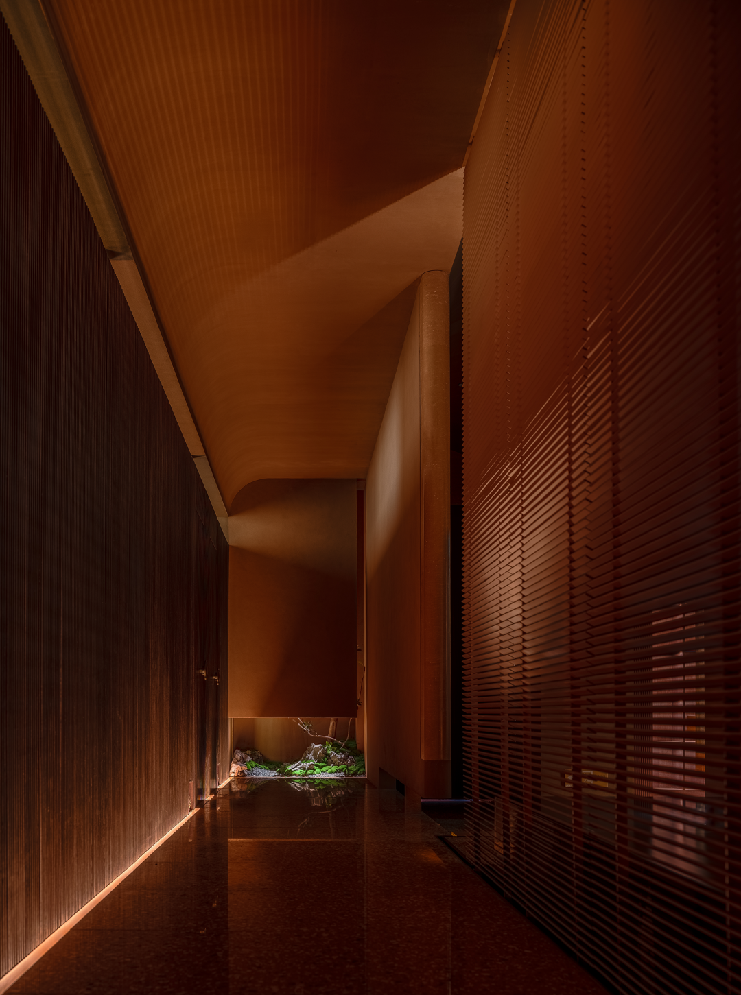 顶部呈拱形的走廊,让人自然地联想到山西的窑洞。弧形,也作为设计的基本元素,贯穿空间各处。流畅的弧形与利落的直角建构出空间语序,有立有破,精致克制,气韵沉雄。