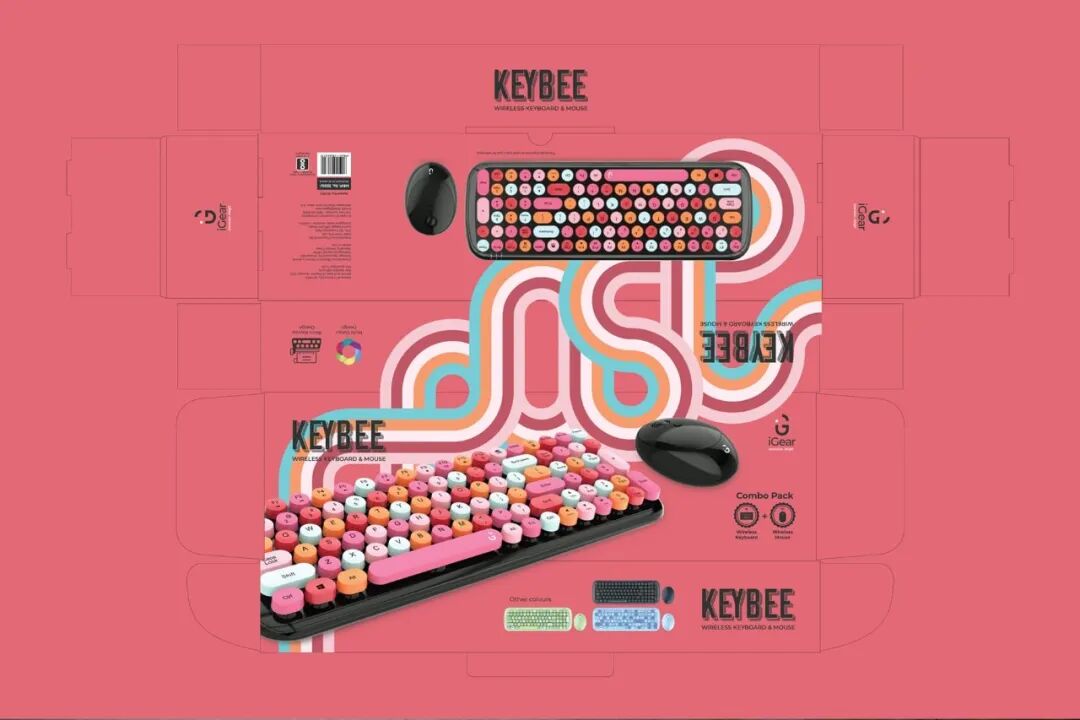 iGear Tech是一家创新的电子配件公司,为全新的复古键盘和鼠标组合设计包装。这些复古的键盘和鼠标有黑色、蓝色、绿色和粉色,采用了复古风格的设计元素和图标,使复古的感觉更加生动。