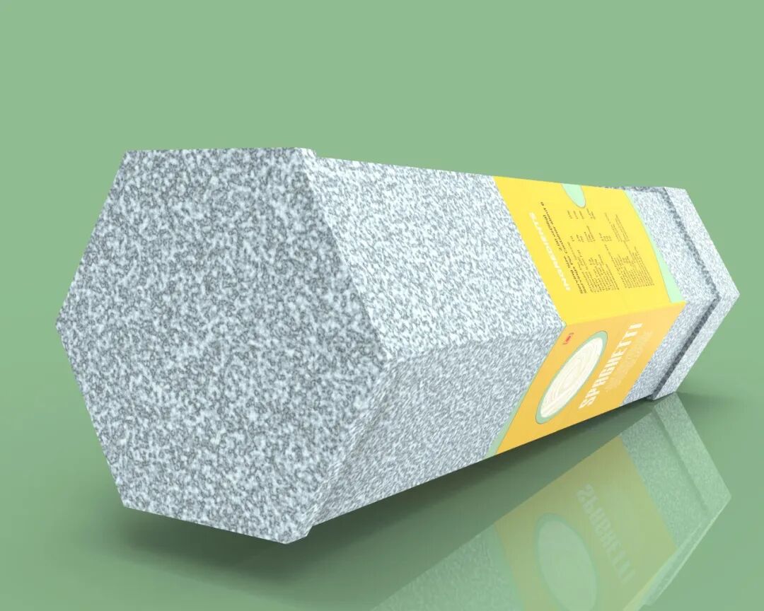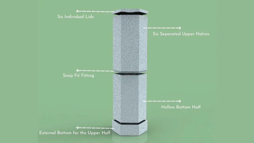 该包装可以转化为两个容器(上半部和下半部),分开的上半部可以通过将外部的下半部放在下面,作为一个固体香料盒使用。中空的下半部可以作为餐具架或铅笔架使用。