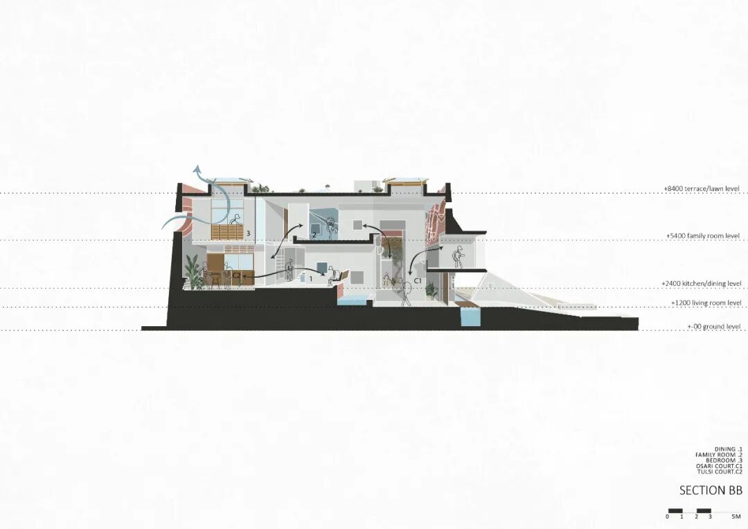 室内被划分成多个功能分区,庭院、阳台、楼梯间卧室等有着开放、半开放和封闭的层次结构。
