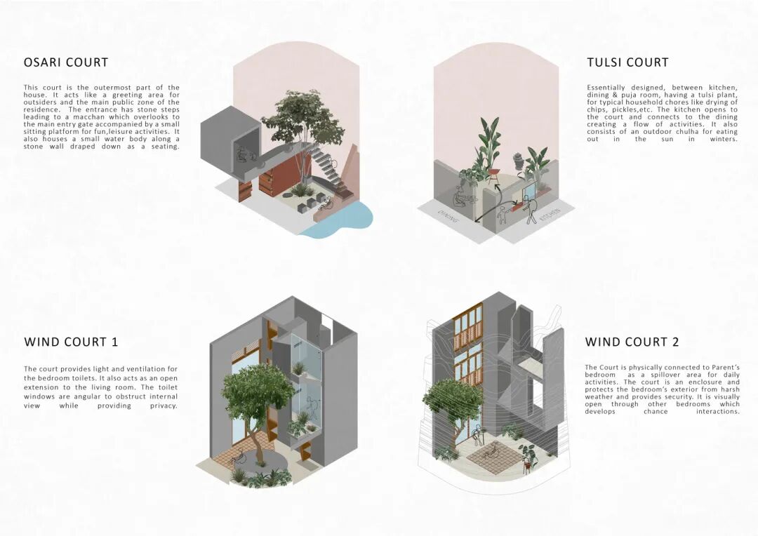 在印度传统建筑中,一个祷告的空间是必须的,一般位于住宅的中央。确定好这个区域以后,卧室,客厅,餐厅围绕这个空间展开。