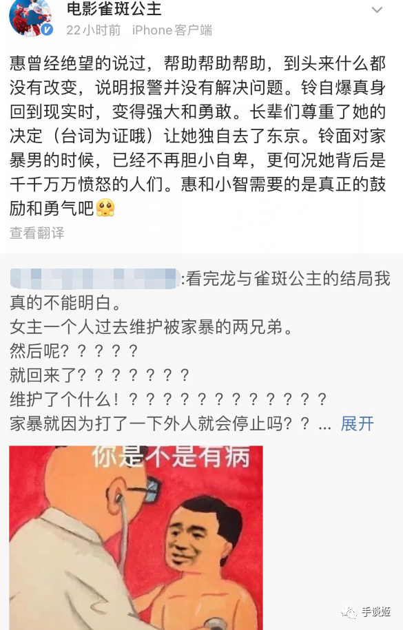 2、故事的结局部分,女主只身一人前往东京去帮助遭受家暴的兄弟二人,既不符合现实生活中正常人面对该场景做出的行为,看着很危险,实际还真被家暴男打了。有点唯心,有点日剧跑式煽情,在剧情处理上确有问题,难怪网友劝细田守找个好编剧。