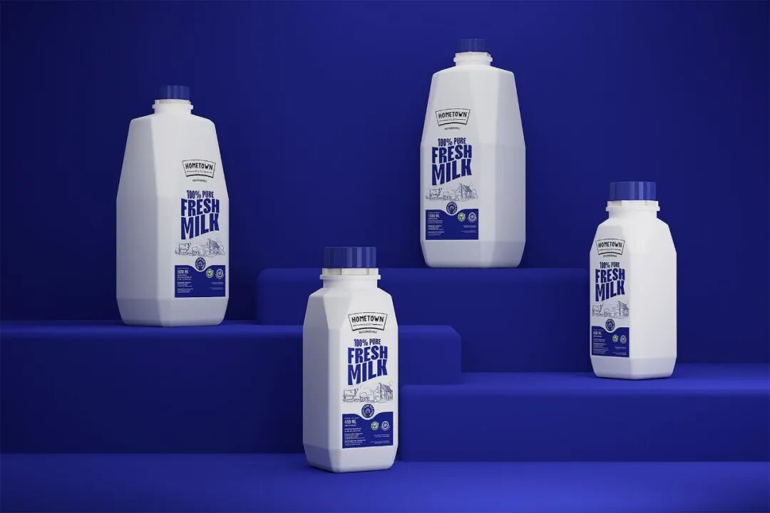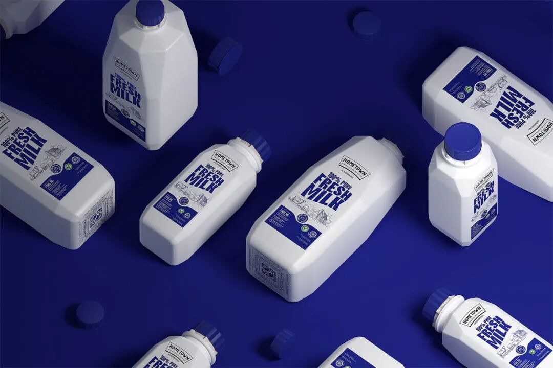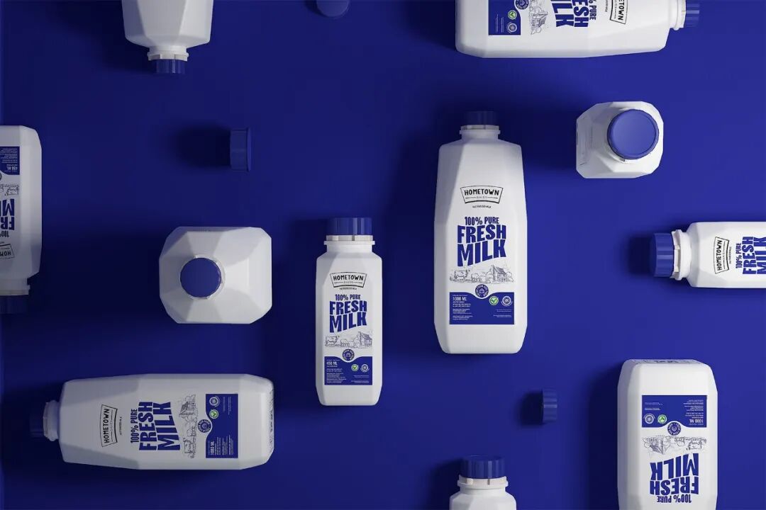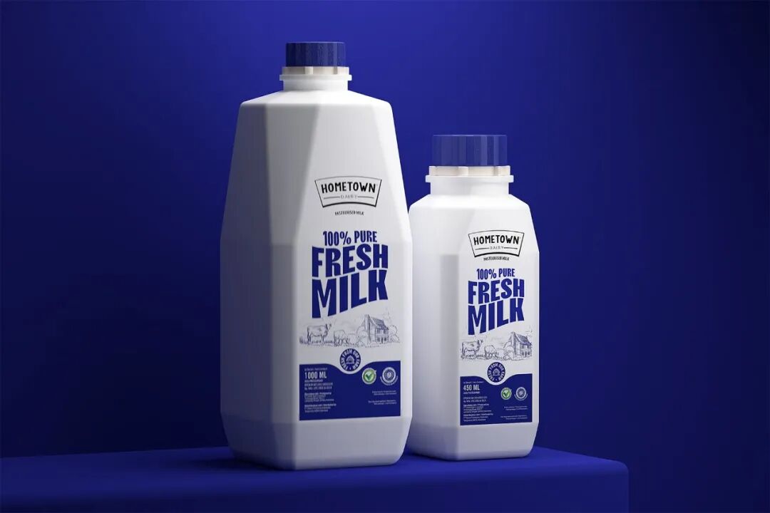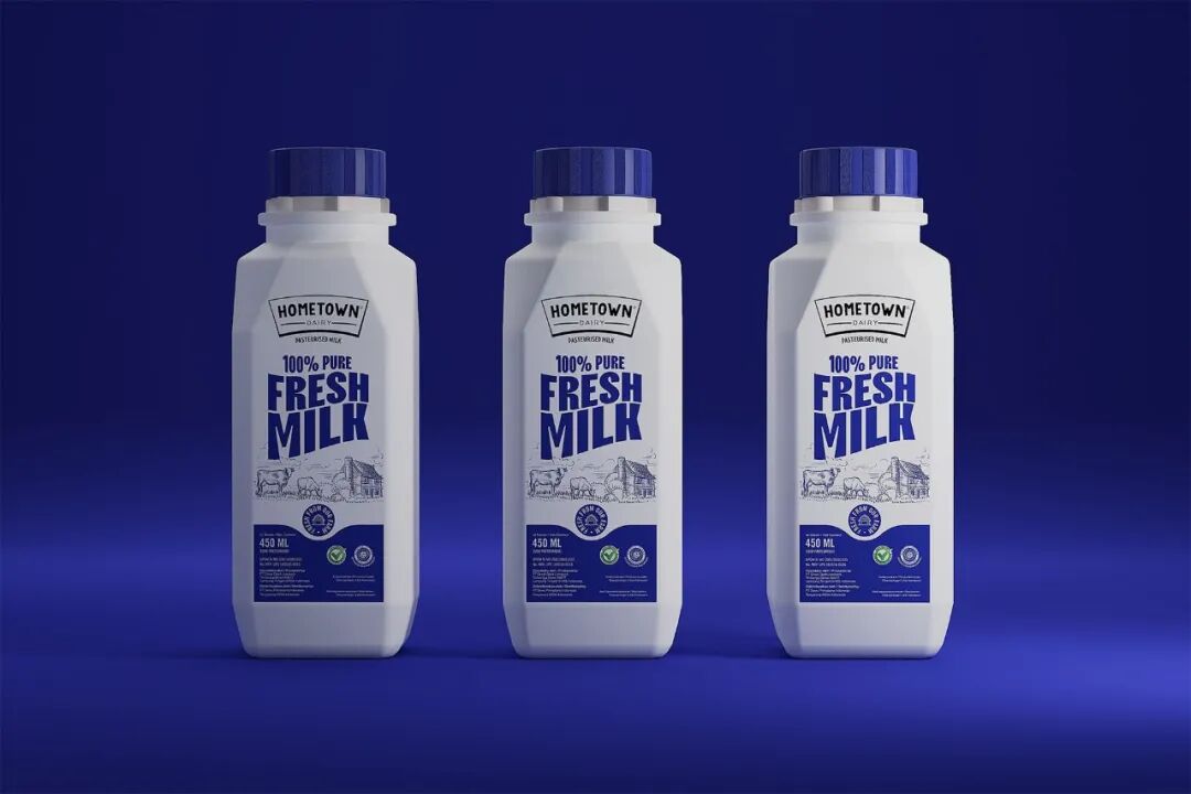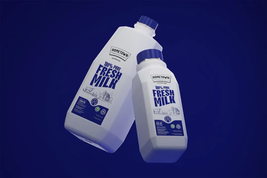 选择Pantone Blue 072C作为主色调,以取代以前经常不一致的蓝色。这种蓝色也是客户认可的要点之一。突出了 "100%纯鲜牛奶 "这一声明,作为HomeTown新设计标签的一个观点,并配以奶牛场的插图。总的来说,HomeTown标签的新设计看起来很有艺术气息,很年轻,很现代。这是为了迎合HomeTown的目标市场,即年轻家庭,特别是年轻母亲。