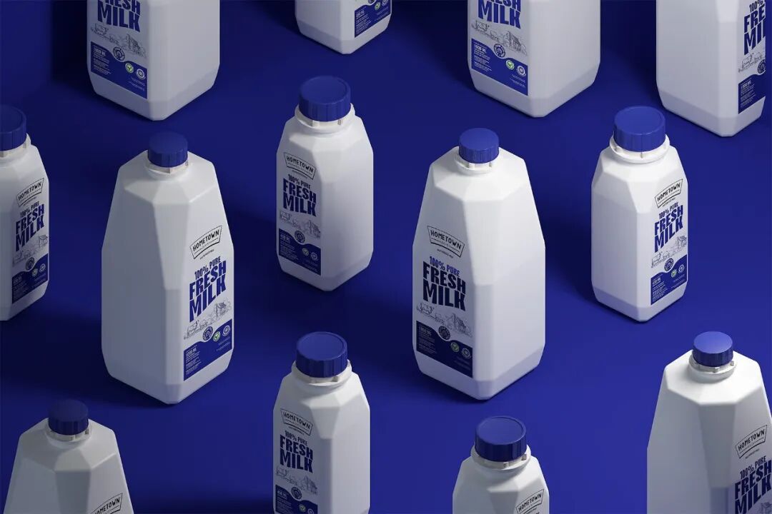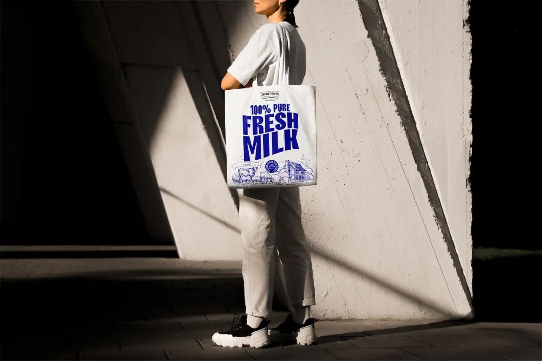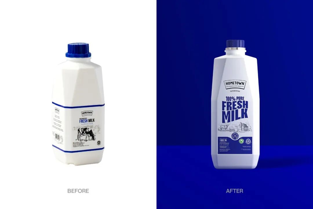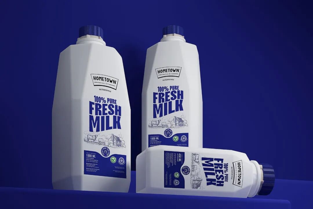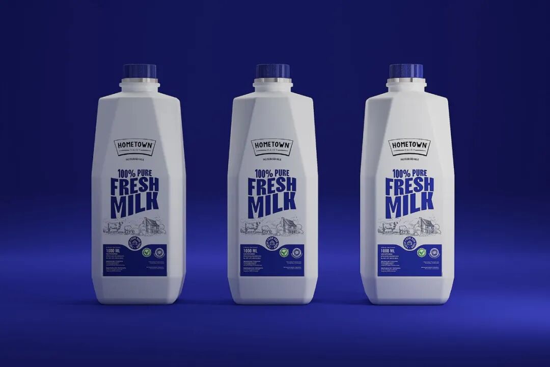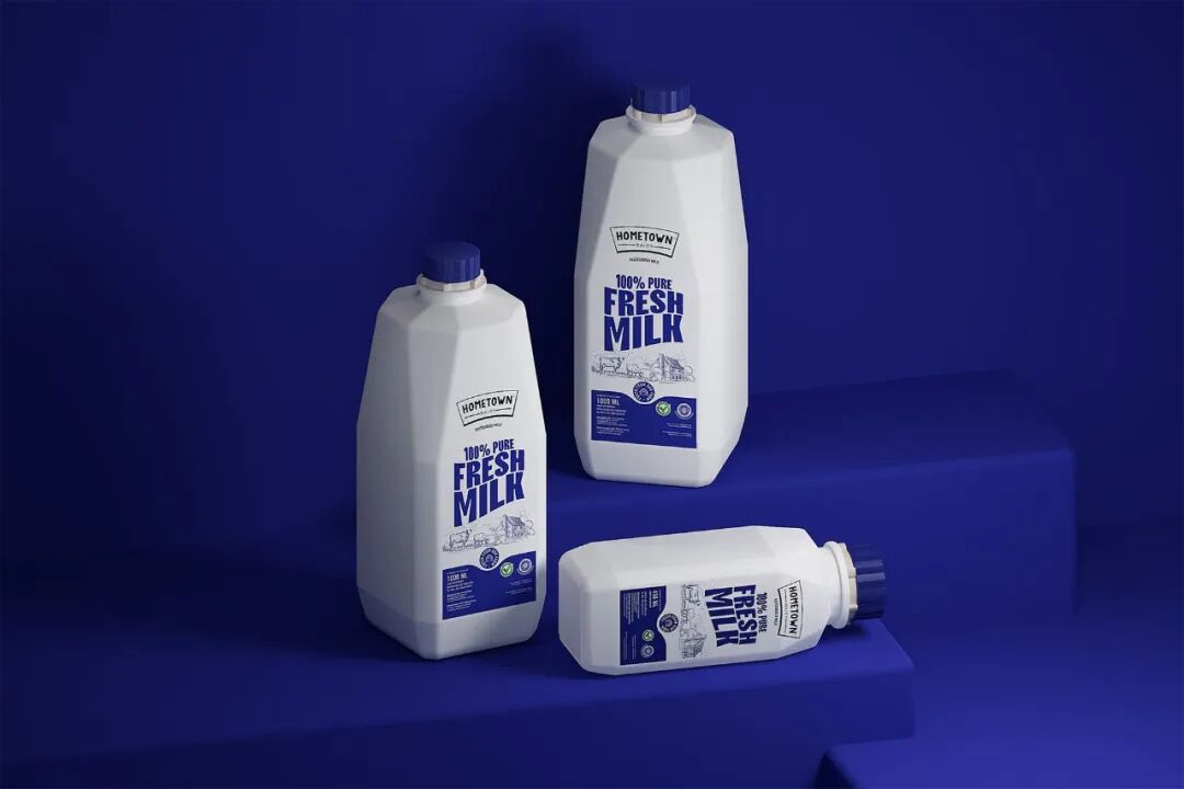 选择Pantone Blue 072C作为主色调,以取代以前经常不一致的蓝色。这种蓝色也是客户认可的要点之一。突出了 "100%纯鲜牛奶 "这一声明,作为HomeTown新设计标签的一个观点,并配以奶牛场的插图。总的来说,HomeTown标签的新设计看起来很有艺术气息,很年轻,很现代。这是为了迎合HomeTown的目标市场,即年轻家庭,特别是年轻母亲。