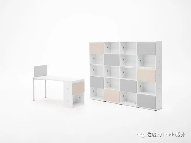 装配家具几乎像按一下按钮一样容易。关节的两部分是平的,当家具不用时,用手指轻轻一碰,就可以弹起,与硬币拧在一起。我们用这个接头来组装盒式架子。不用的架子可以作为橱柜式桌子的腿。作为橱柜门的软垫板也作为桌子之间的隔墙;放在一起,它们还可以分割办公空间。其结果是:一个高度功能化的设计,允许员工在相同的小空间内集中精力和放松,并提供了方便改变办公室布局所需的物理灵活性。