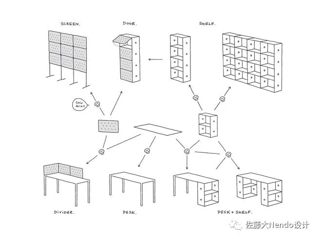 the organization’s growth and the scale of each new project.We wanted our office furniture to be easily expandable and multi-functional,too. We developed a ‘coin joint’ that can be screwed and unscrewed with asingle coin, rather than requiring tools.